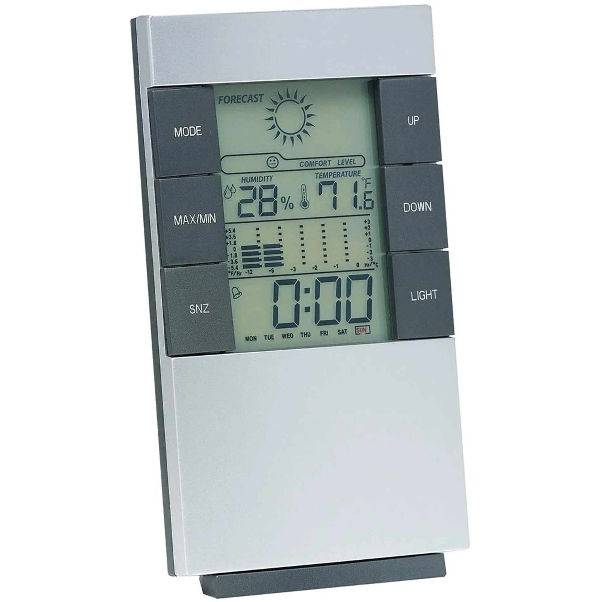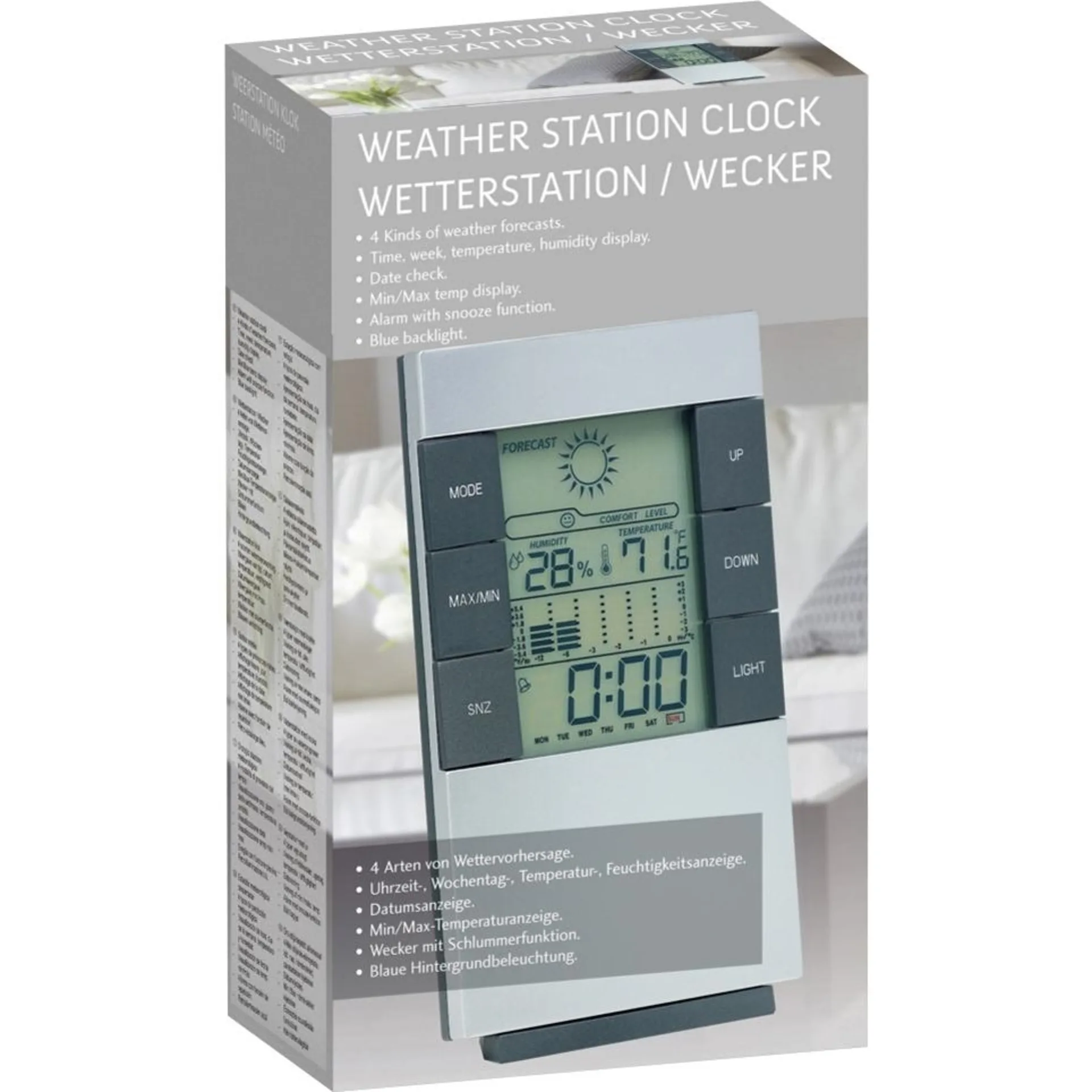 Affichages et fonctions de la station météo: 4 types de prévisions météo, heure, jour de la semaine, température, affichage de la date, réveil avec fonction snooze, rétroéclairage bleu.