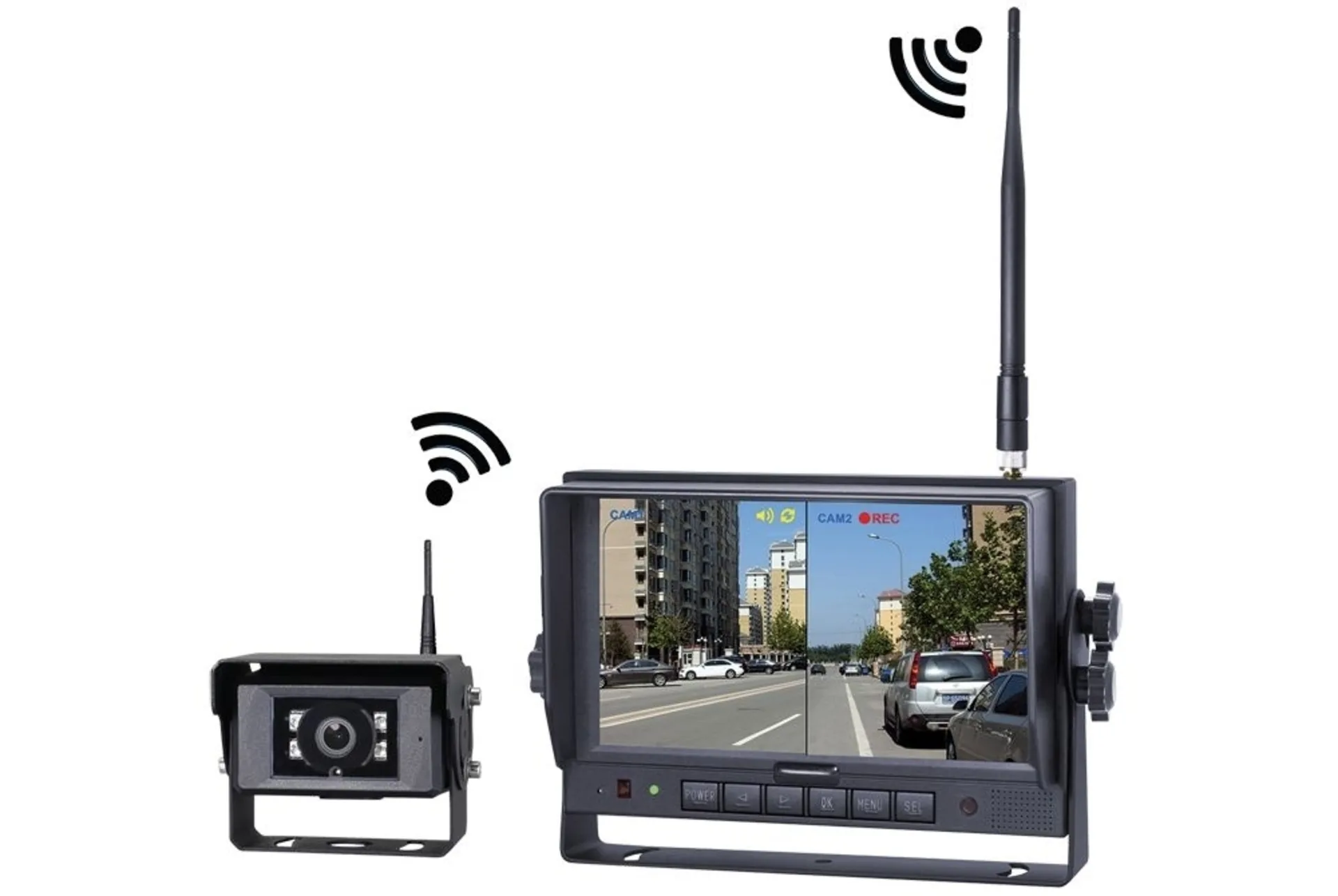 - écran couleur HD 7" 720P, 1024 × 3 (RGB) × 600 - 4 entrées de caméra (numérique=sans fil) - Affichage Dual Splitt (2 caméras en même temps) - Fonction d'enregistrement sur carte Micro-SD (non incluse) - Haut-parleur intégré Caméra (nécessite de l'électricité) : - Champ de vision : 46 × 36 m - Distance de visibilité 120 m, la nuit : jusqu'à 10 m - Angle de vision 120° - Température de fonctionnement. -30° à +70° C - IP69K - 12/24 V (nettoyeur haute pression s'il te plaît à une distance de 1 m minimum)