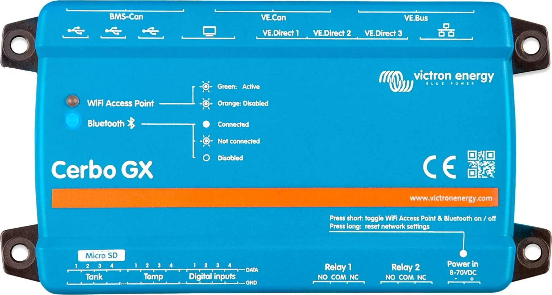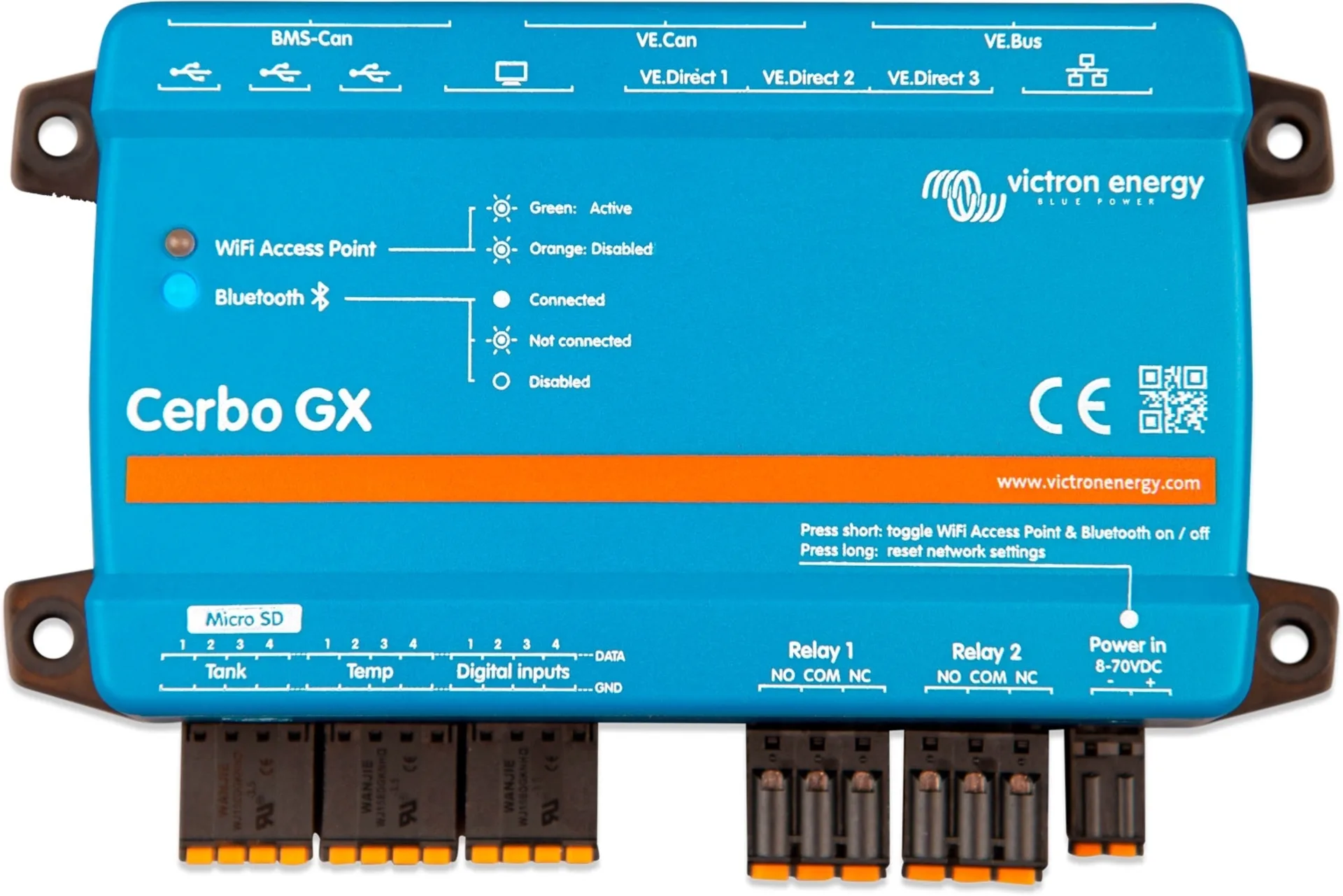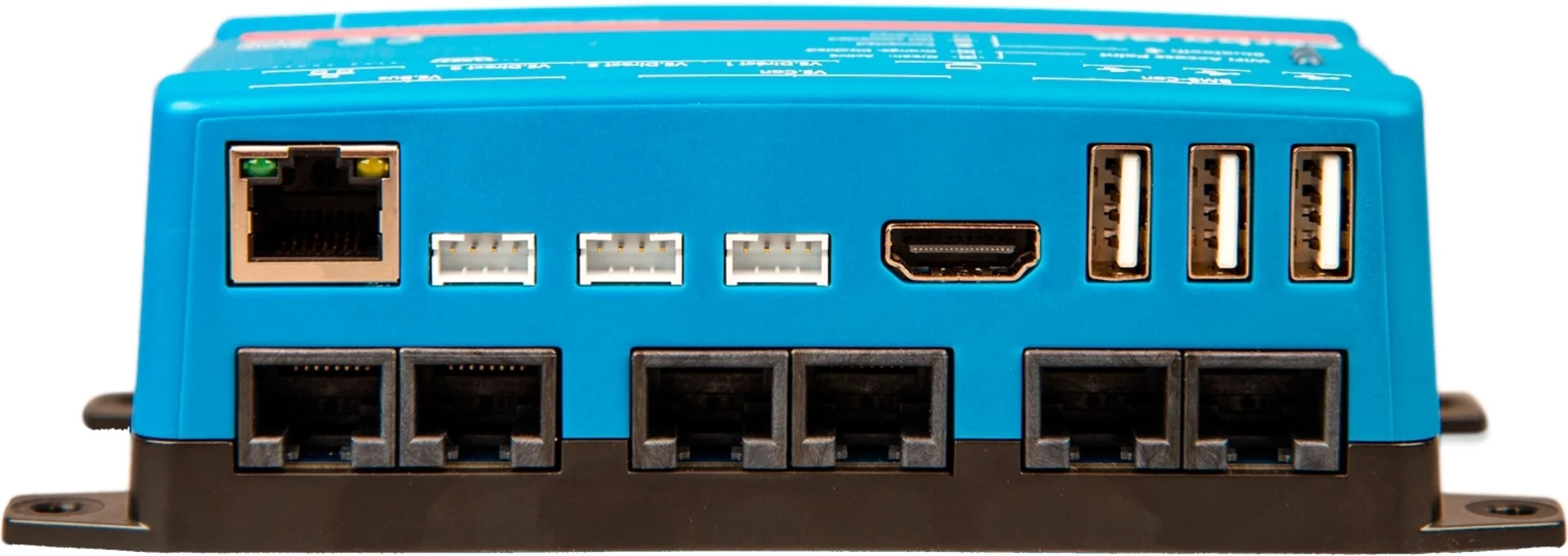 Le Cerbo GX maximise les performances des composants de ton système en temps réel et les maintient en parfaite harmonie. Avec son processeur Dual Core et son port de bus CAN supplémentaire, tu peux désormais soutenir des systèmes encore plus grands ; suis de près les batteries (au lithium) contrôlées, tandis que le deuxième port peut soutenir jusqu'à 25 chargeurs solaires VE.Can connectés simultanément. Grâce au nouveau support NMEA 2000-out, le GX s'intègre facilement dans n'importe quel réseau de bateaux. Quatre ports de réservoir et quatre ports de température ainsi que 3 ports VE.Direct, 3 ports USB, 4 entrées numériques et 2 relais te permettent d'étendre le contrôle à un nouveau niveau. Maximiser les performances du système n'a jamais été aussi facile.