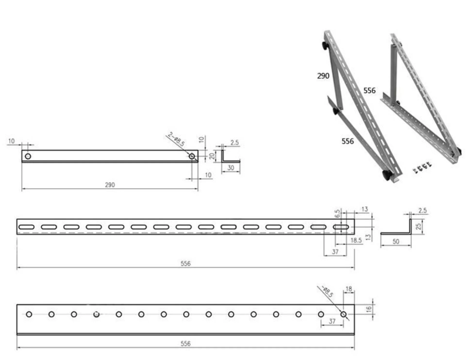 La surface d'appui des angles est de 556mm. Le système de 22 pouces convient donc aux panneaux solaires jusqu'à environ 100W.