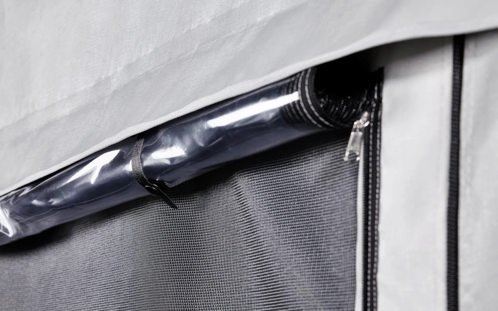 Les fenêtres latérales sont équipées de l'extérieur d'un film de fenêtre de haute qualité, facile à ouvrir au moyen d'une fermeture éclair. Pour la protection contre les insectes, une moustiquaire est fournie de série sur les deux parois latérales.