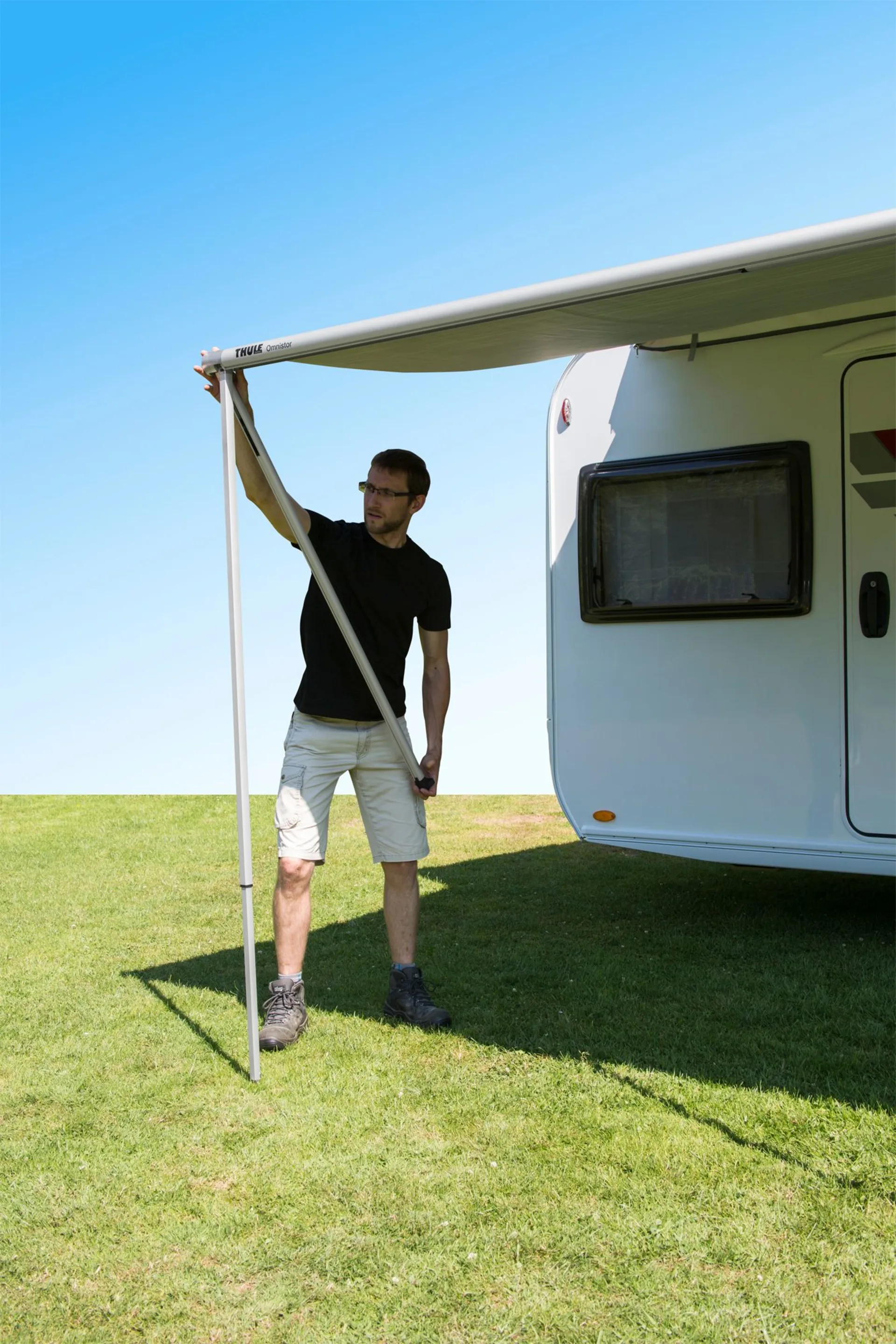 Thule Omnistor Markisen ab 4,00 m verfügen über eine integrierte Befestigung für einen optionalen dritten Stützfuß zur Sicherstellung höchster Stabilität. Ein integriertes Support Kit verteilt den Druck der Spannarme sicher auf die Wohnwagenwand.