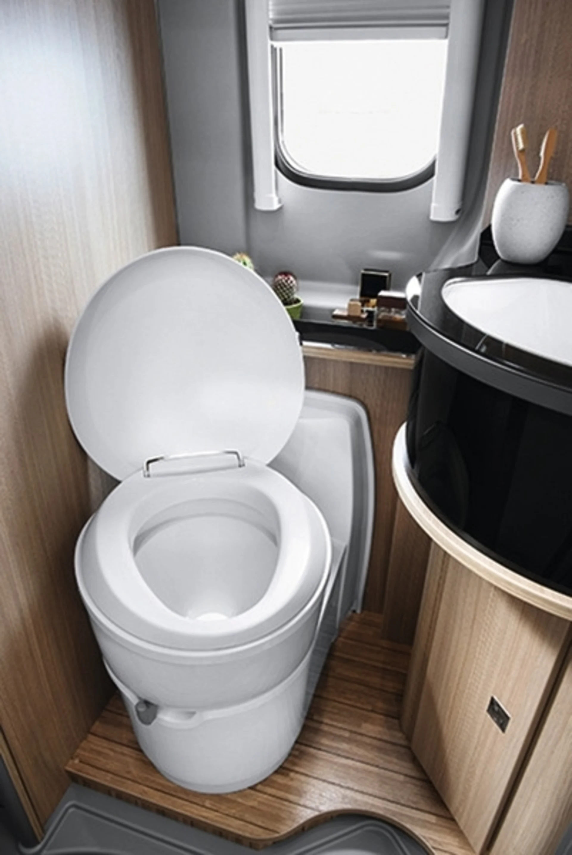 Les toilettes à cassette intégrées se composent de deux parties : une toilette installée en permanence et un réservoir à matières amovible. Un indicateur intelligent t'indique quand le réservoir doit être vidé. Tu peux facilement retirer le réservoir via une trappe de service située à l'extérieur du véhicule. Tu as le choix entre différents modèles. La position de la trappe de service 3 peut être verticale ou horizontale. Avantages : confort d'assise et d'utilisation optimal plastique léger, de haute qualité et résistant système de chasse d'eau silencieux et puissant, sur toute la cuvette une cuvette de toilettes, en taille et en confort, presque comme à la maison facile et pratique à vider 3 ans de garantie