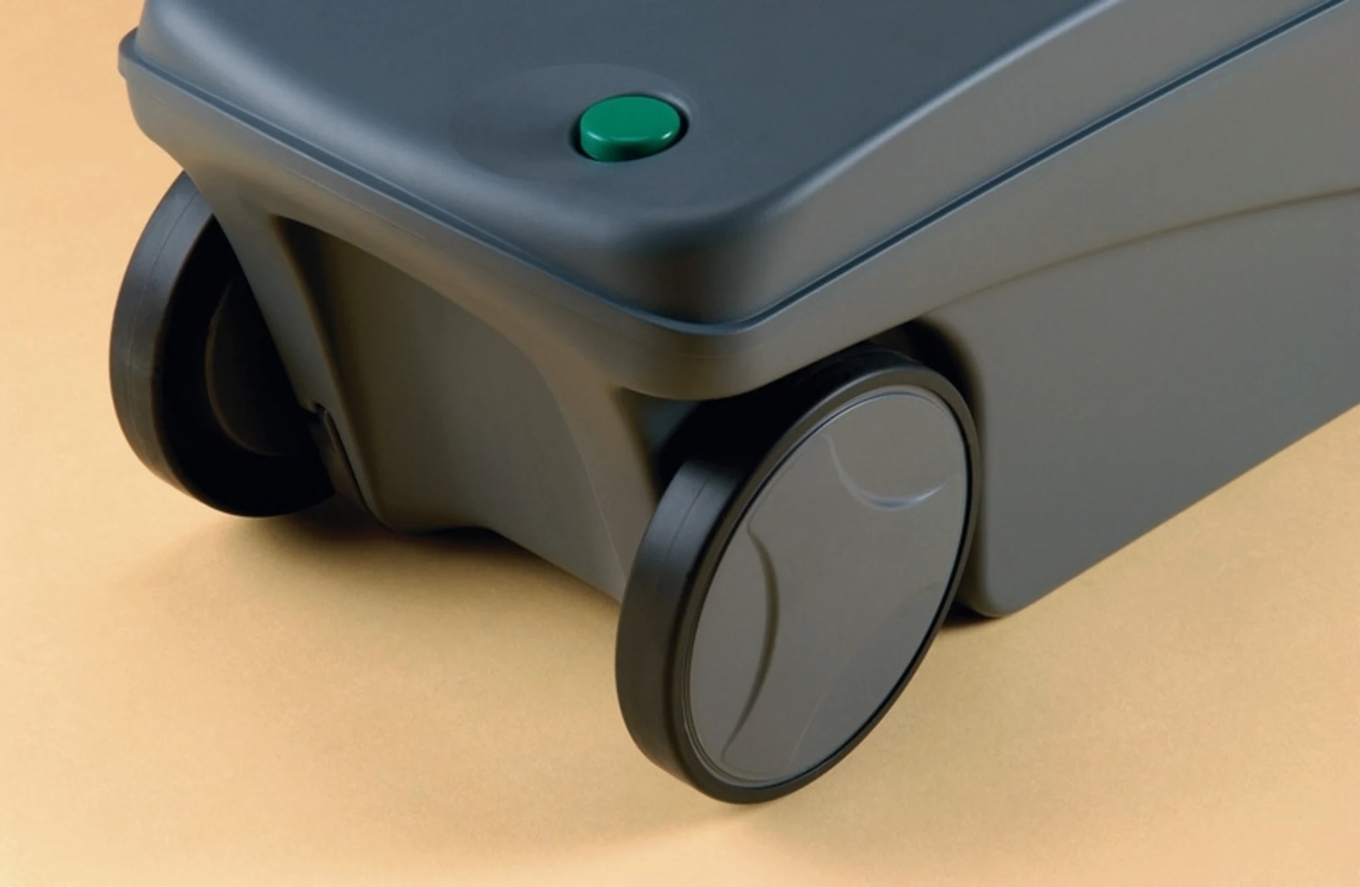 Réservoir à matières sur roulettes et avec poignée rabattable pour le tirer
