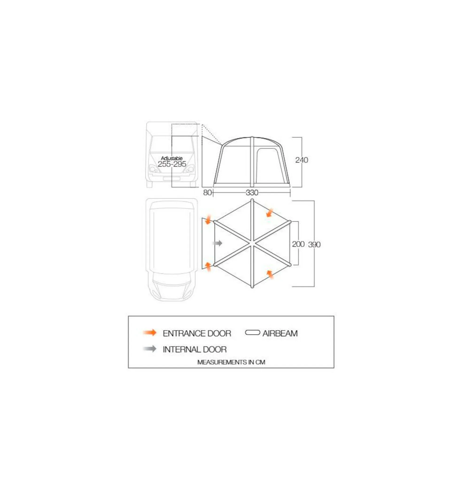 (Airbeam=technique d'armature pneumatique innovante ; le tuyau d'air se trouve dans une housse de protection robuste en polyester et celle-ci se trouve dans une enveloppe flexible de la tente extérieure, le tuyau est gonflé à une pression de 8 PSI (0,56 bar))