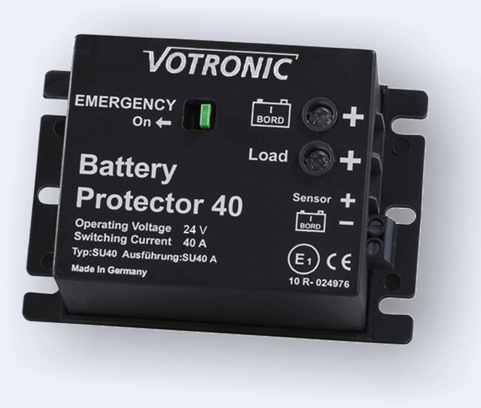 L'appareil VOTRONIC Battery Protector 40 se connecte entre la batterie d'alimentation et le consommateur et convient à tous les types et marques de batteries au plomb (acide, gel, AGM). Il protège la batterie d'une décharge profonde dangereuse ainsi que les consommateurs et l'équipement d'une sous-tension et d'une surtension et, contrôlé par un interrupteur externe, il peut encore servir d'interrupteur principal de batterie à distance.