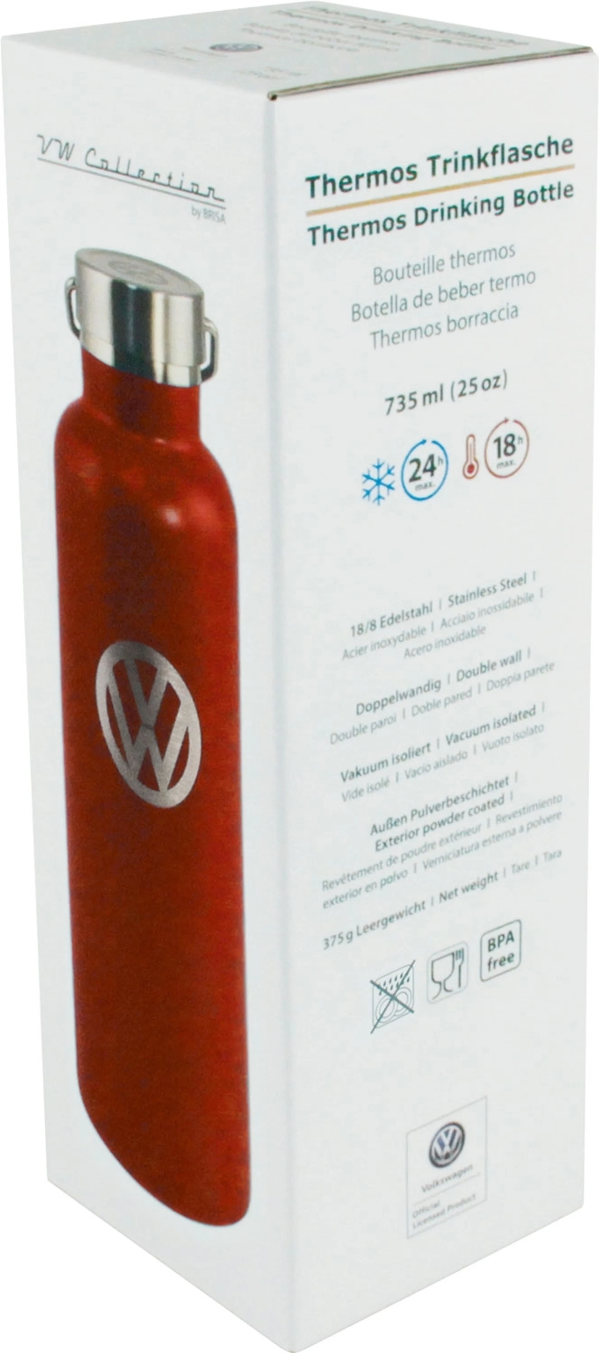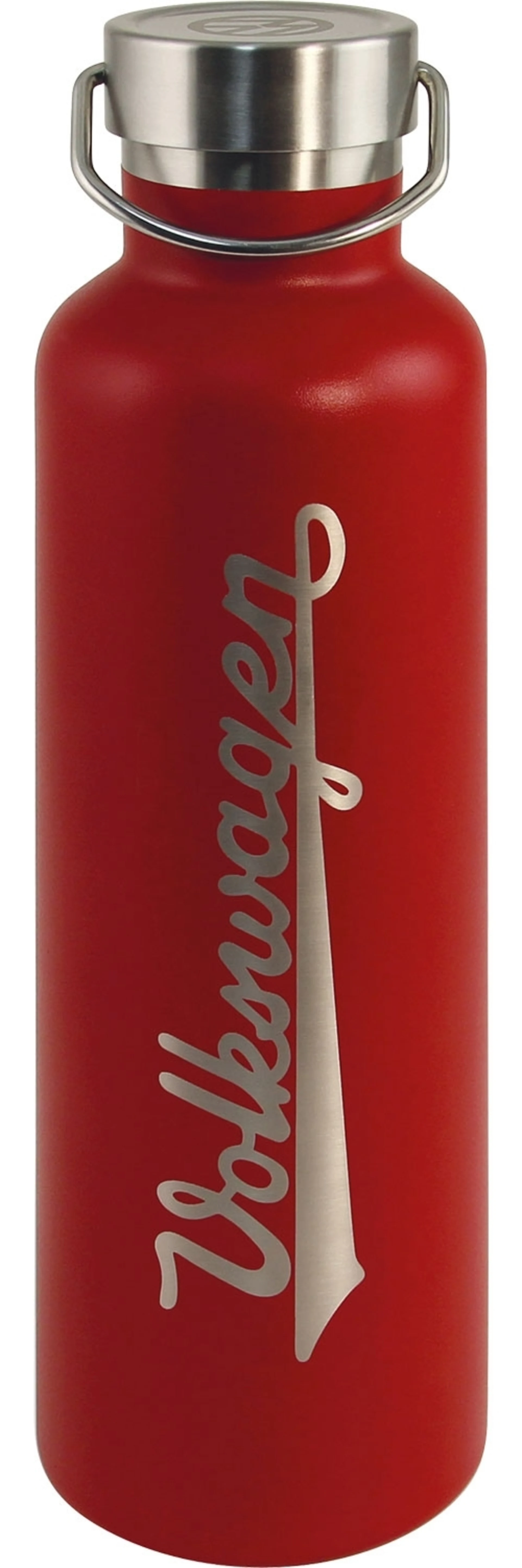 Doppelwandige Vakuum Thermo-Flasche aus Edelstahl mit Volkswagen Schriftzug und VW Logo, herausgelasert aus einer robusten einfarbigen Pulverbeschichtung. Die rote Trinkflasche hat ein Fassungsvermögen von 735 ml und hält Getränke bis zu 24 Stunden heiß und kalt.