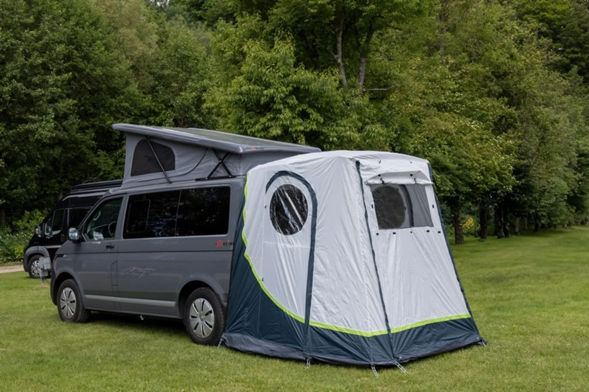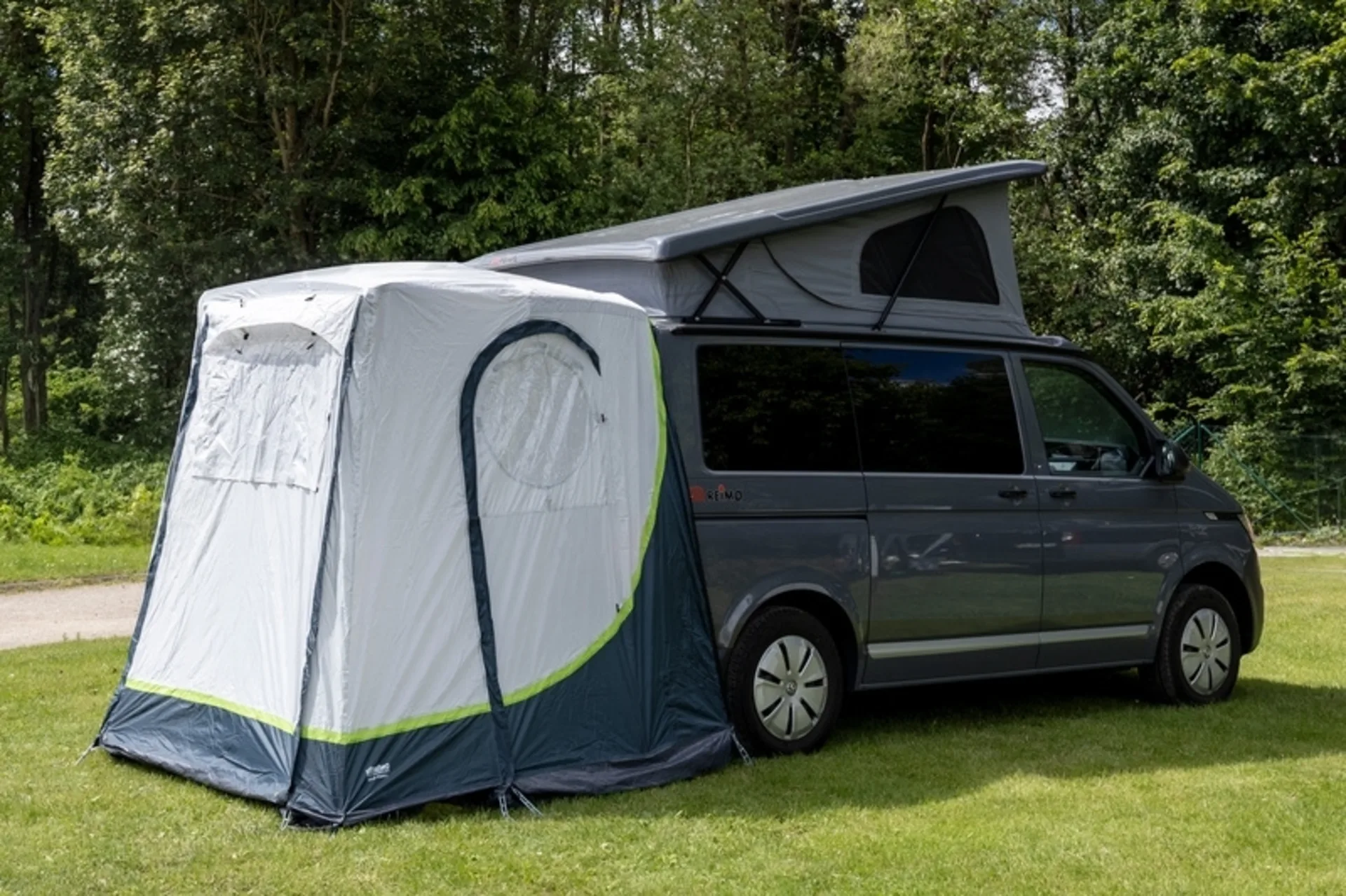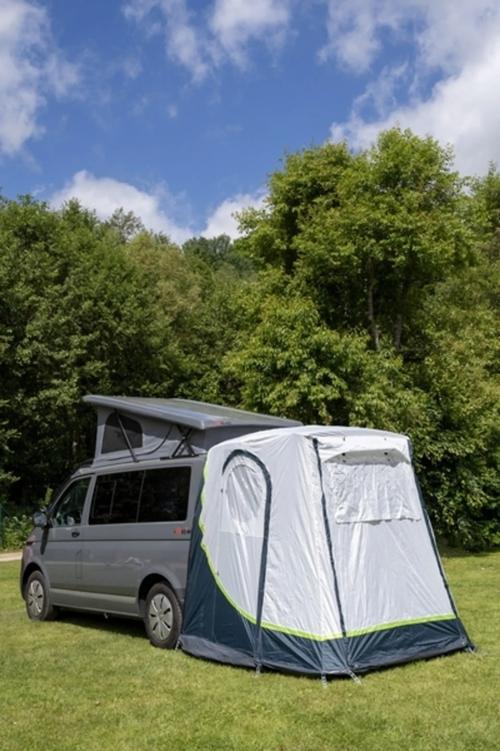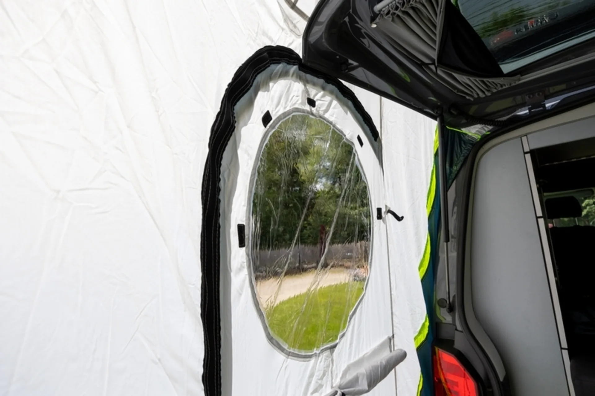 Pas d'armature, une petite taille et un montage facile font de la tente arrière Upgrade 2 le choix parfait pour tous les conducteurs de fourgons. Il suffit de l'enfiler sur le hayon pour créer de l'espace supplémentaire à l'arrière, que ce soit pour un lit de camp, un vélo ou simplement pour avoir plus d'air frais dans le véhicule. L'utilisation de la fenêtre dans le hayon permet d'avoir de la lumière, la porte arrière et la porte latérale dans la tente permettent d'être polyvalent. Porte avant relevable comme auvent. Une autre utilisation est l'utilisation comme vestiaire ou tente de douche. Les fenêtres sont teintées pour plus d'intimité.