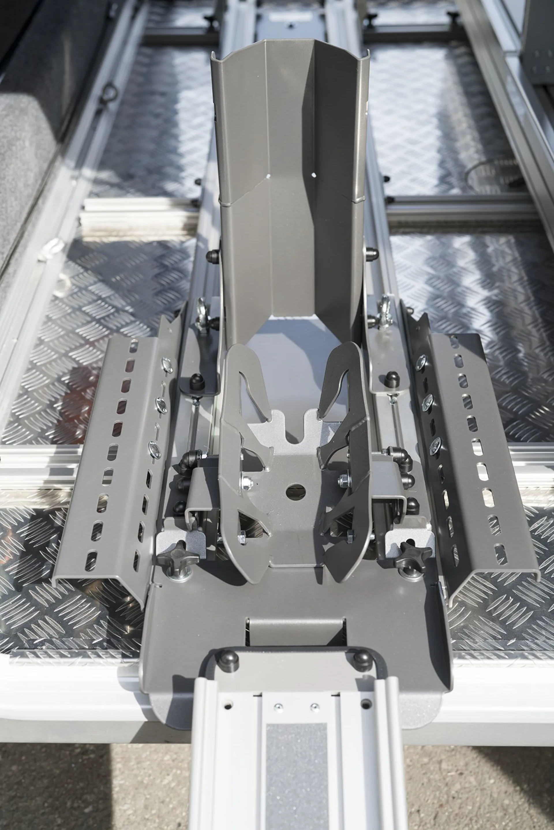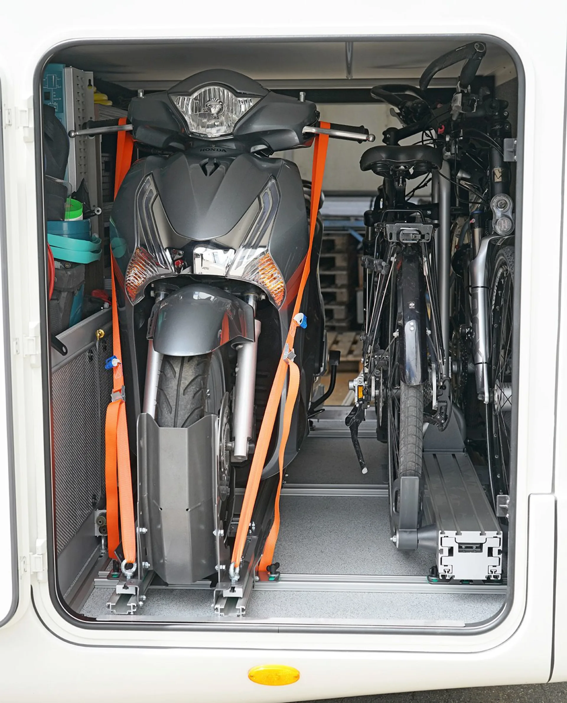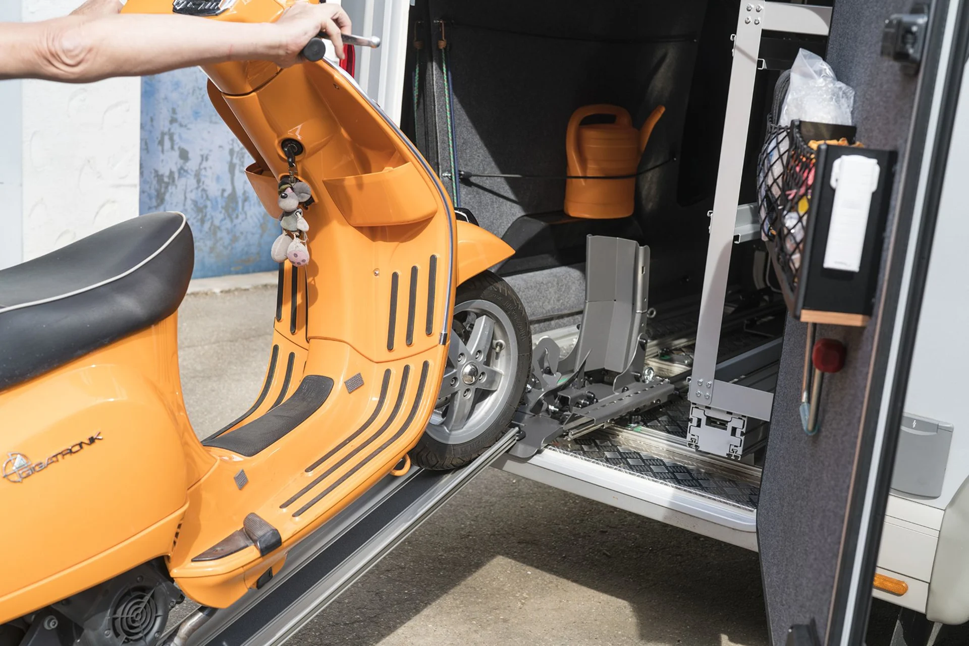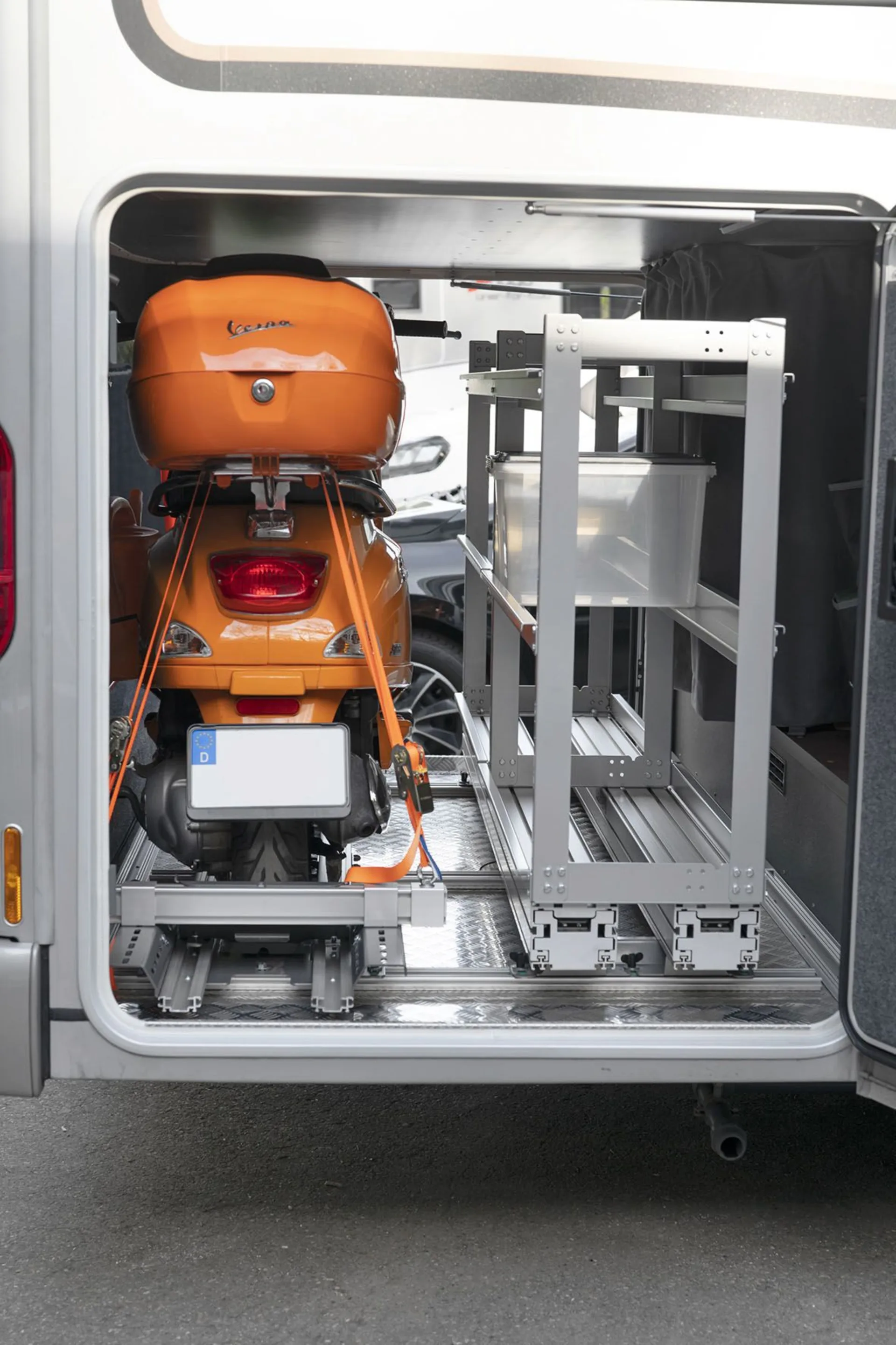 Nach dem Verladen kann der Roller auf den Querschienen in den seitlichen Stauraum verschoben werden, um mehr Lademöglichkeit zu schaffen oder um weitere seitlich verschiebbare Module wie Fahrradträger-SlideMove oder Regal-LoadMove auf den Querschienen zu nutzen.