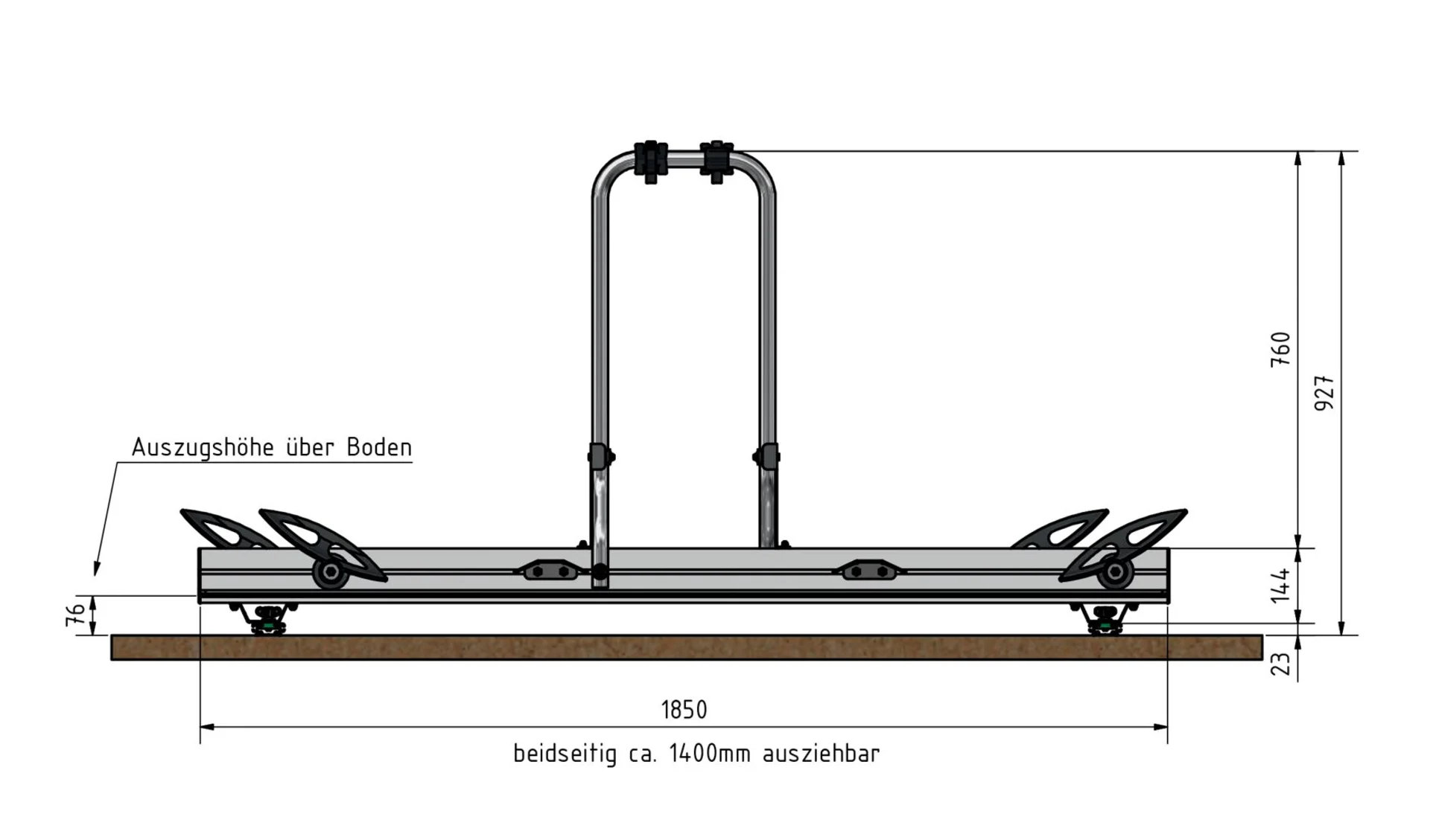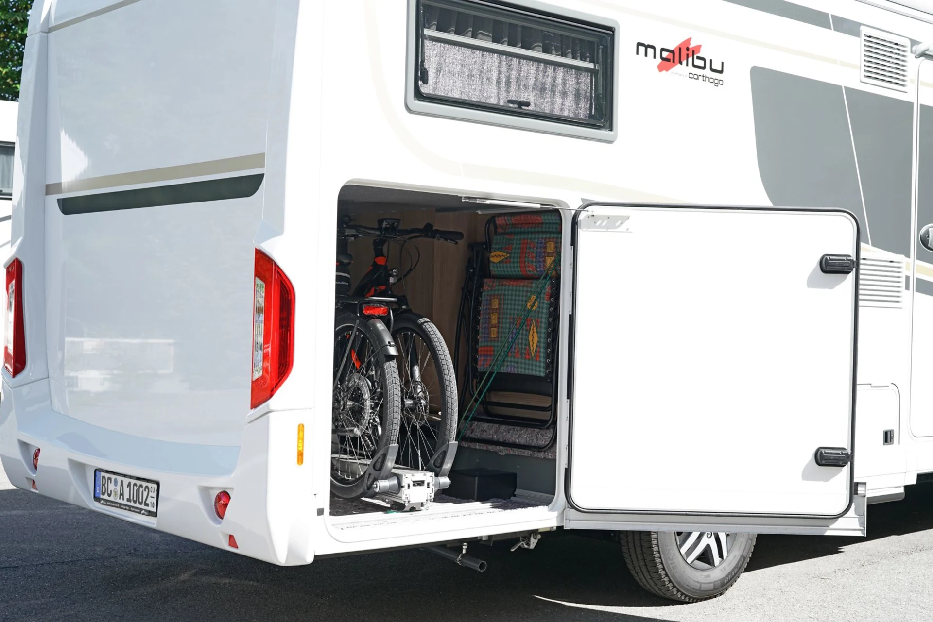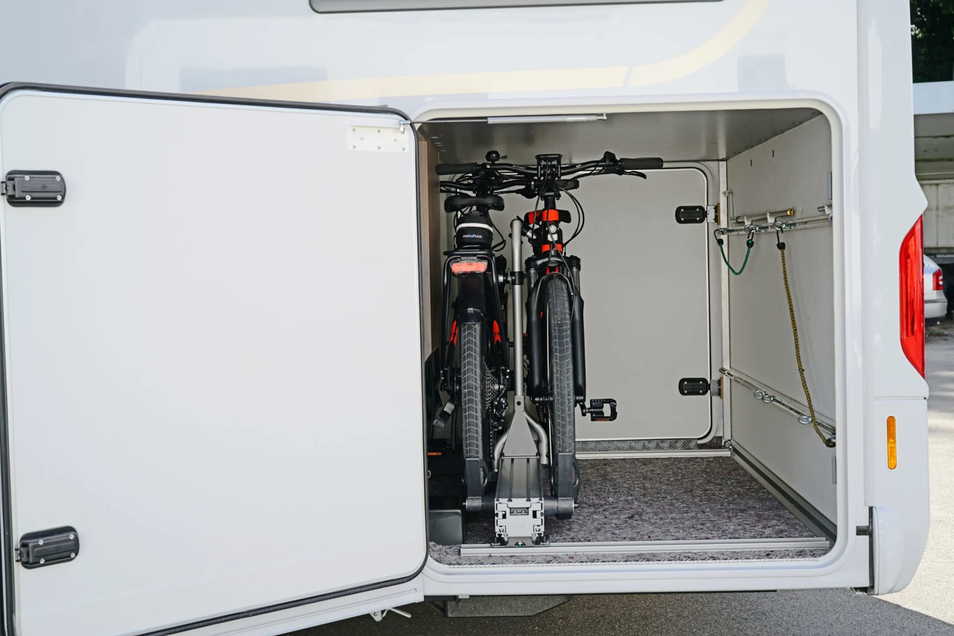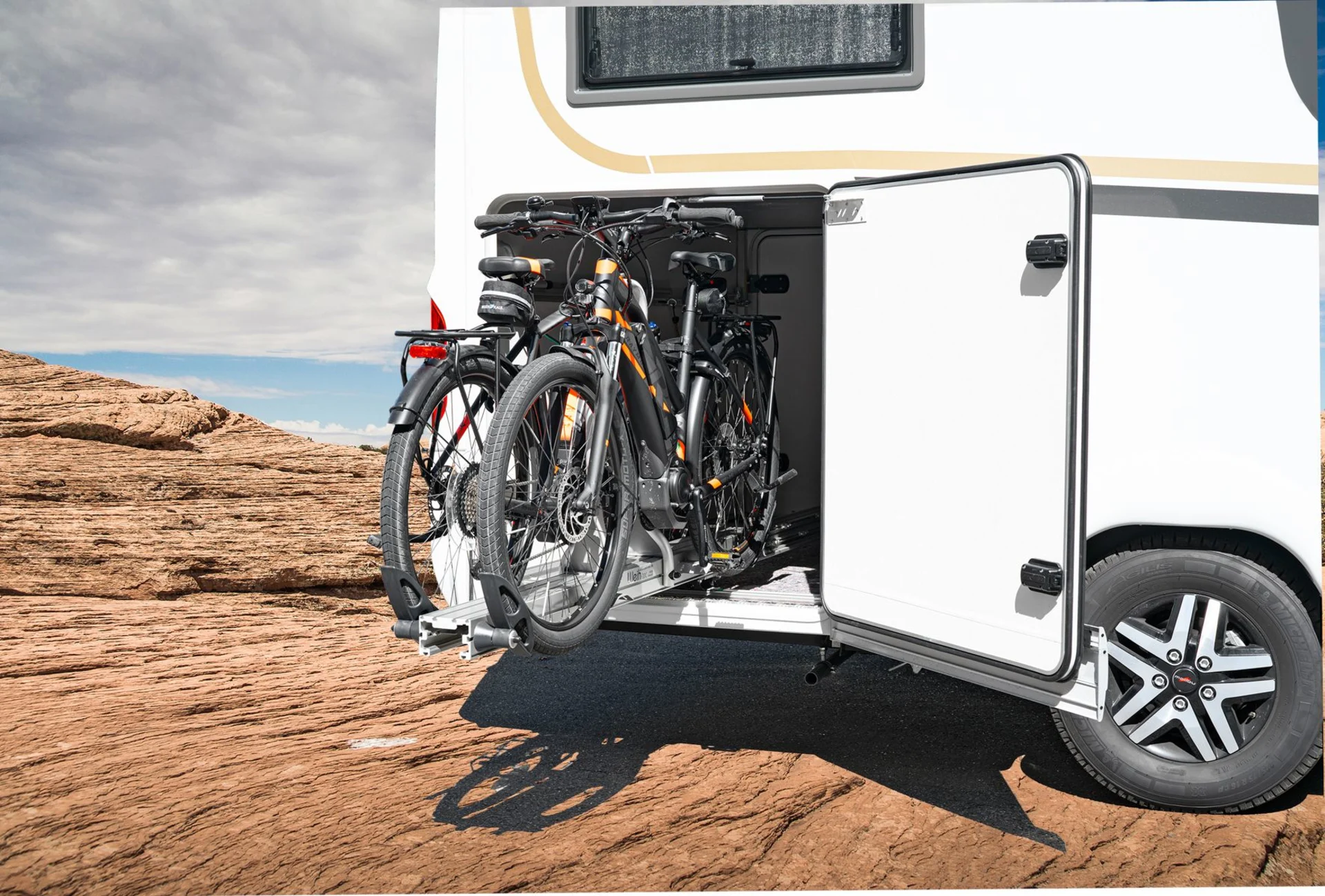 Um die Fahrräder in die Heckgarage zu laden, wird der Träger mit einer Hand entriegelt und bis zum Anschlag herausgezogen. Die Fahrräder werden in die dafür vorgesehenen Schalen gestellt, in denen sie schon einen hervorragenden Stand haben (geweitete Schalen für breitere Reifen auf Anfrage) und mit Haltearmen fixiert. Der Träger wird in der Heckgarage auf Querverschiebeprofilen montiert. Durch die zusätzliche seitliche Verschiebemöglichkeit in der Heckgarage können die Fahrräder nach dem Beladen platzsparend zur Seite geschoben werden.