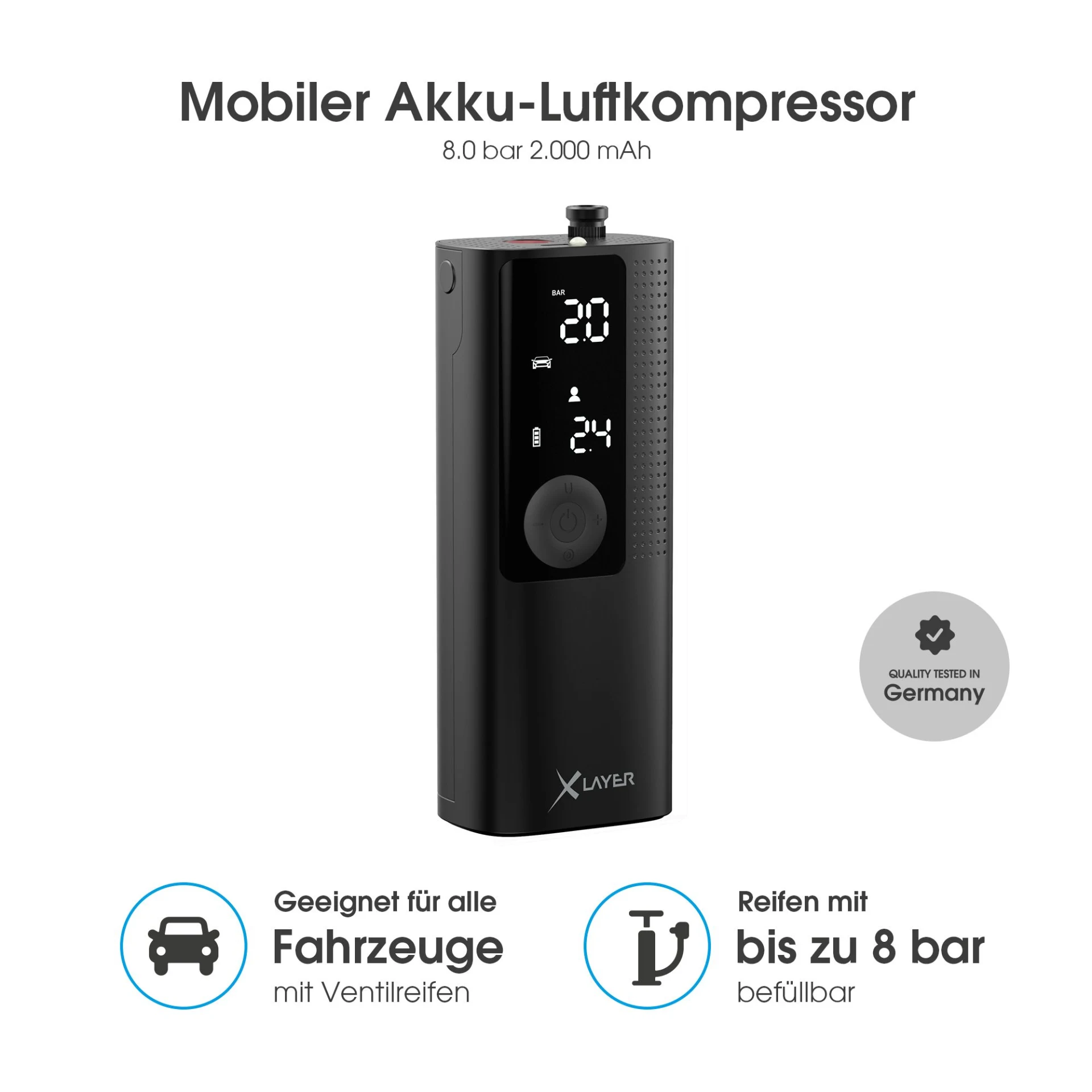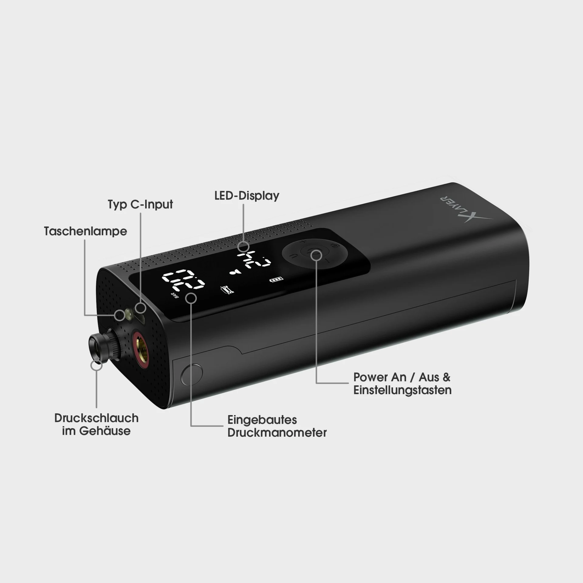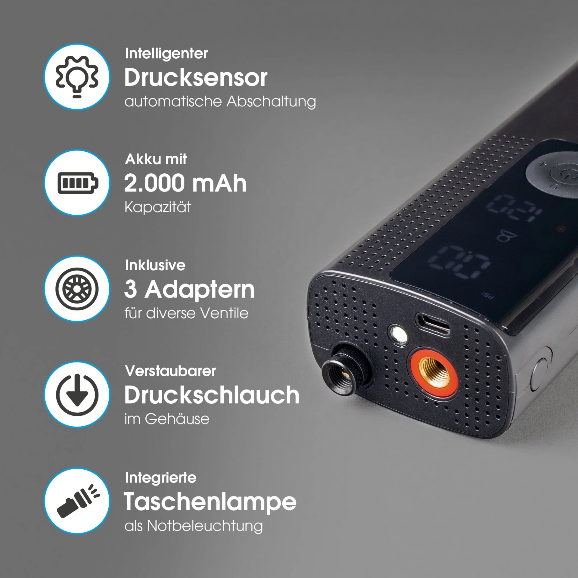 Grâce à sa taille compacte et à son poids léger, c'est le compagnon idéal pour les balades à vélo, les vacances ou les voitures et pour les motos. La batterie lithium-ion intégrée fournit 2 000 mAh et permet ainsi de gonfler plusieurs fois les pneus de voiture, de moto et de vélo. La plage de pression d'air est suffisante avec 1-120 psi / 0,07-8,3 bar. De plus, le compresseur d'air à batterie dispose d'une lampe LED intégrée.