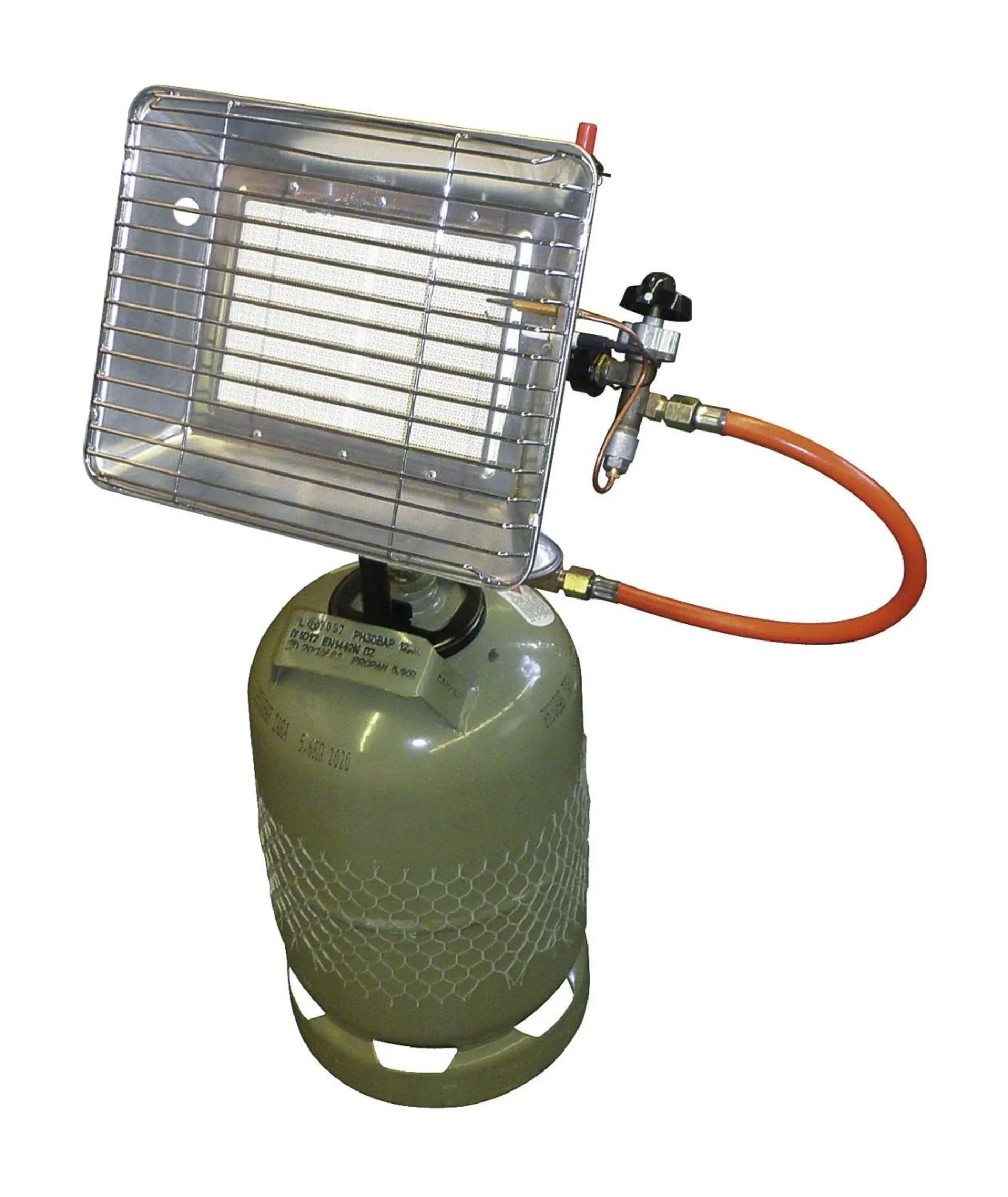 - Leistung: min. 2,70 kW / max. 4,20 kW; Verbrauch: 0,2 – 0,37 kg/h; Geeignet für Propangasflaschen 5 kg und 11 kg