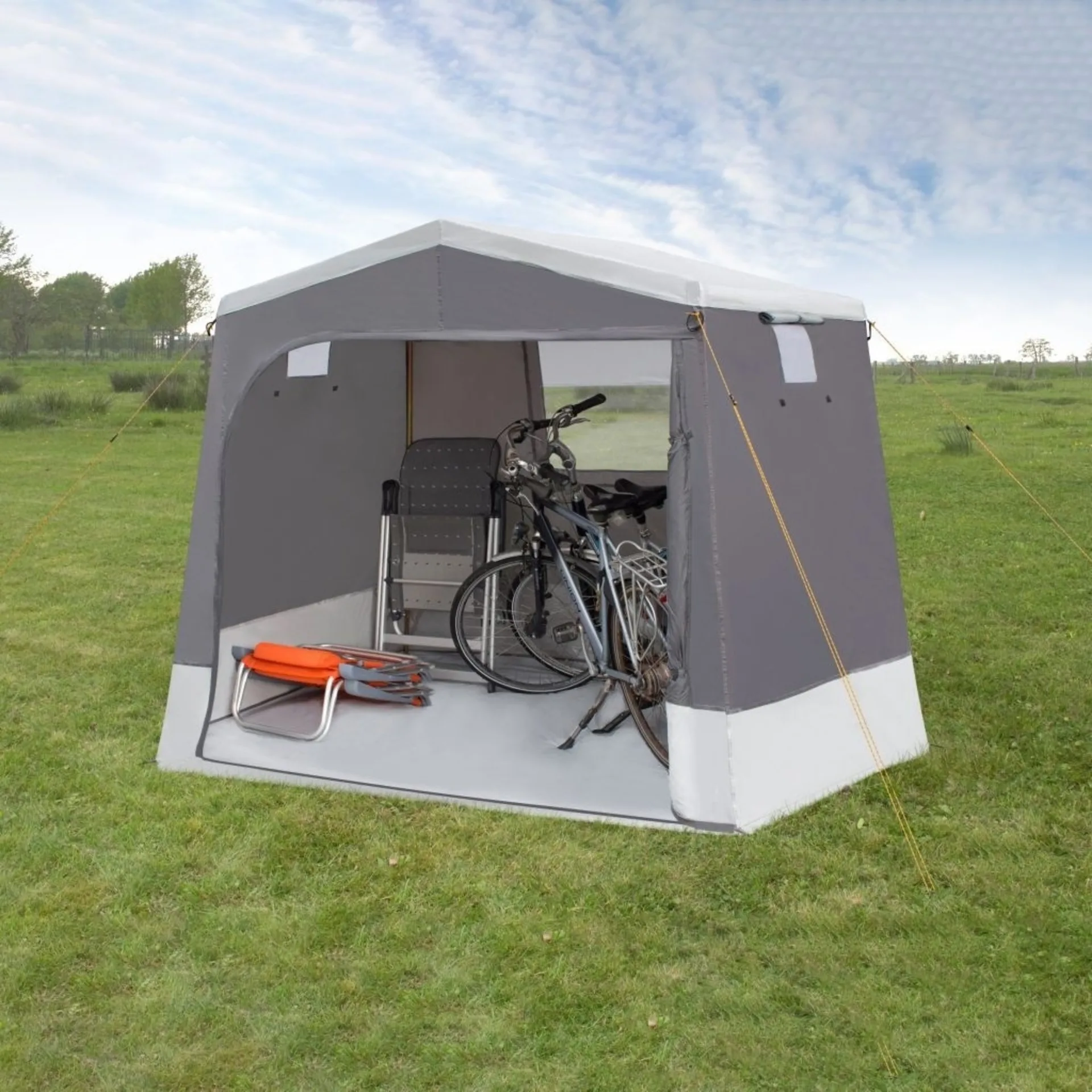 Das Gerätezelt ist ideal als Abstellraum oder auch Toilettenzelt. Die Vorderwand mit Reissverschluss ist seitlich rollbar. Auf der Rückseite befindet sich ein Gazefenster mit Prägefolienabdeckung. An den Dachecken ist jeweils eine Schlaufe zur Sturmabspannung angenäht. 3 Belüftungsmöglichkeiten. Material: 100 % Polyester Oxford/PVC. ,Gestänge: ø 19 mm Stahl, ø 22 mm Stahl. ,