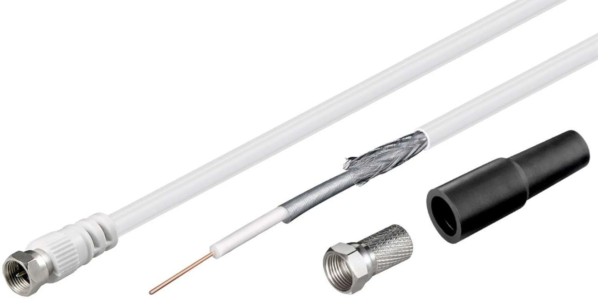 - einseitig lose Kabelenden für eine vereinfachte Wanddurchführung, andere Seite mit fest montiertem F-Stecker