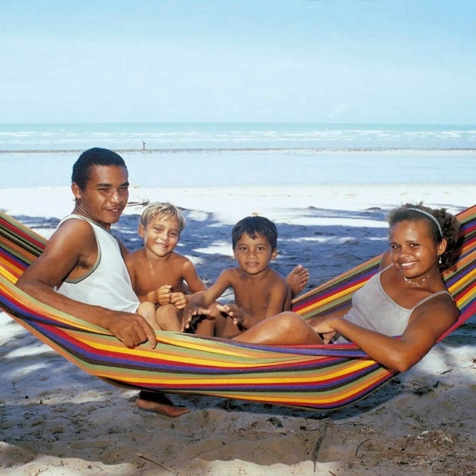 Paradiso ist höchster brasilianischer Hängemattenkomfort und etwas ganz Besonderes: Nur wenige Webstühle sind geeignet, ein 1,75 m breites Tuch herzustellen. Um diese riesige Hängematte gleichzeitig extra stabil und superweich zu bekommen, werden knapp 5000 Fäden miteinander verwoben! Die extradicken Schnüre verbindet Amazonas nochmal per Handarbeit mit einem Webband, damit auch hohe punktuelle Belastungen ausgeglichen werden, was der Matte eine sehr hohe Lebensdauer gibt. Material: 85 % Baumwolle, 15 % Polyester.