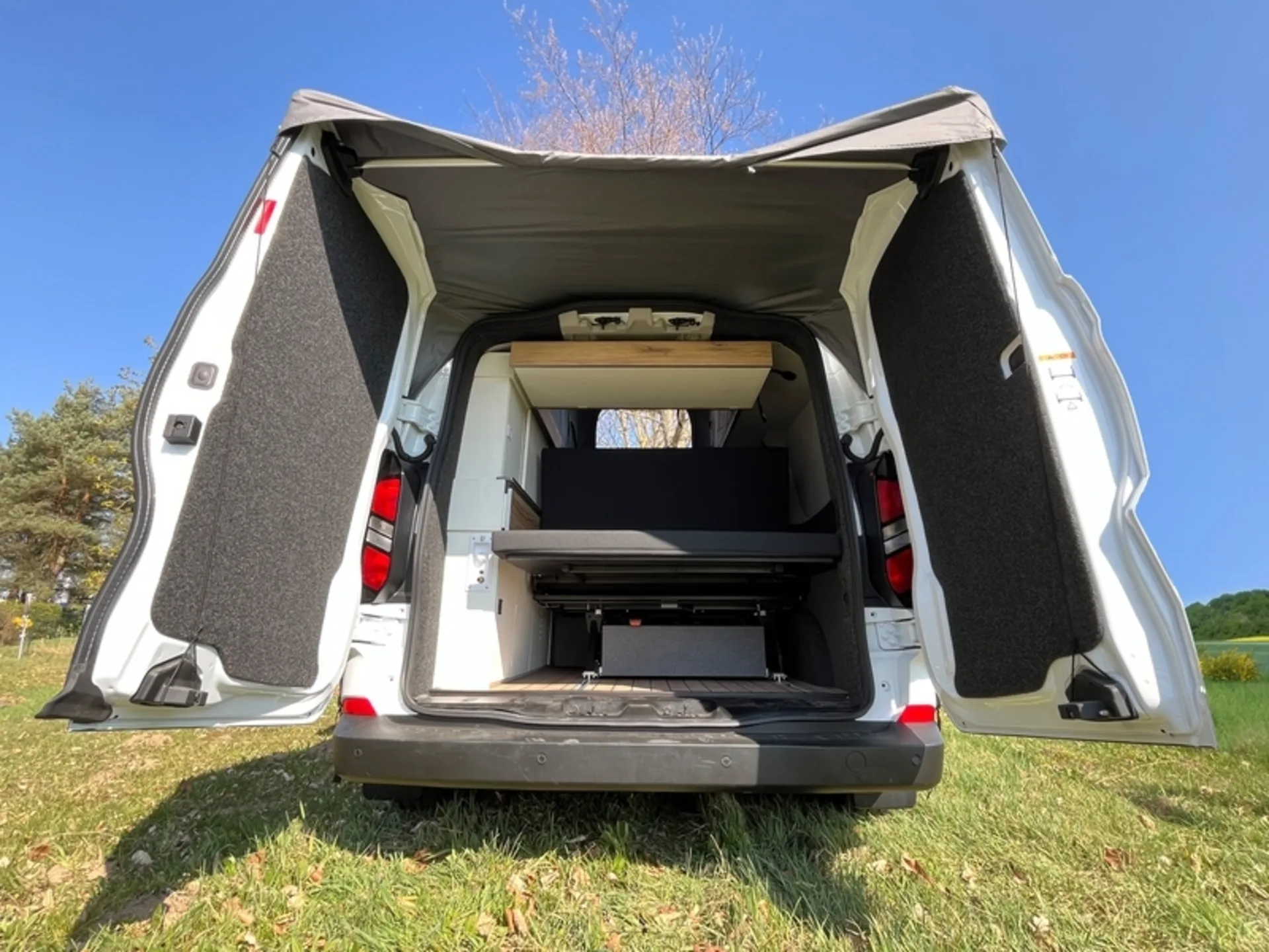 Das neu entwickelte Sonnendach wird einfach über die geöffneten Hecktüren gespannt und dient sowohl als Sonnen- als auch Regenschutz und ist ebenfalls ein Schutz vor Zugluft bei geöffneten Türen. Eine teleskopierbare Spannstange zwischen den Türen definiert den Abstand und hält die Plane. Die Verbindung und Abdichtung zum Fahrzeug erfolgt mittels eines längenverstellbaren elastischen Gurtes und Kunststoffhaken, die Fixierung mit Magneten. Das Sonnendach ist ideal z.B. bei Verwendung von Außenküchen oder Aufenthalt im Bus mit geöffneten Hecktüren. Einfache und schnelle Montage ohne Veränderungen am Fahrzeug.