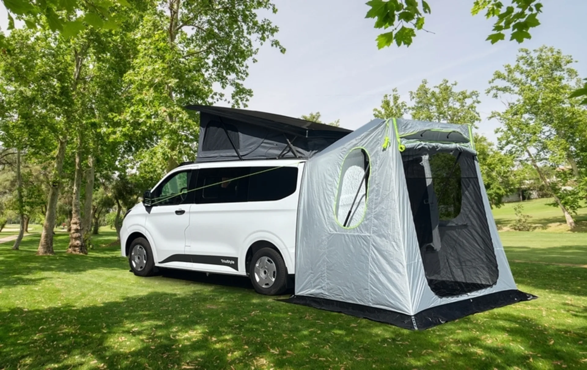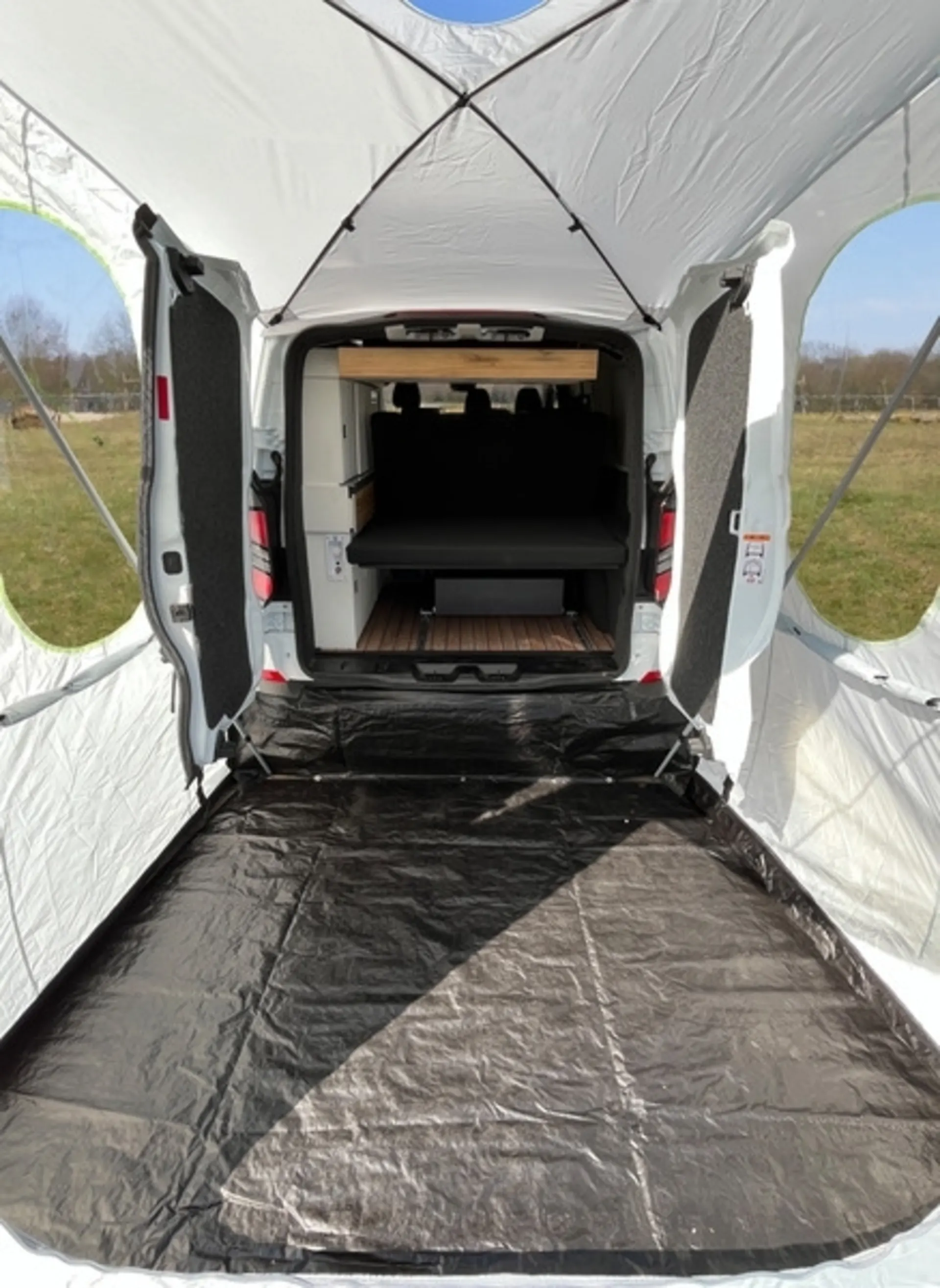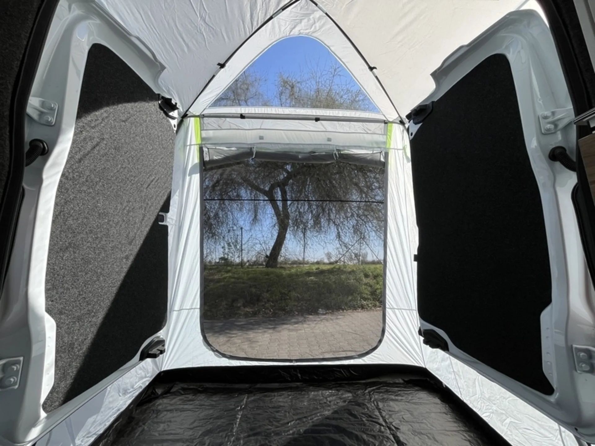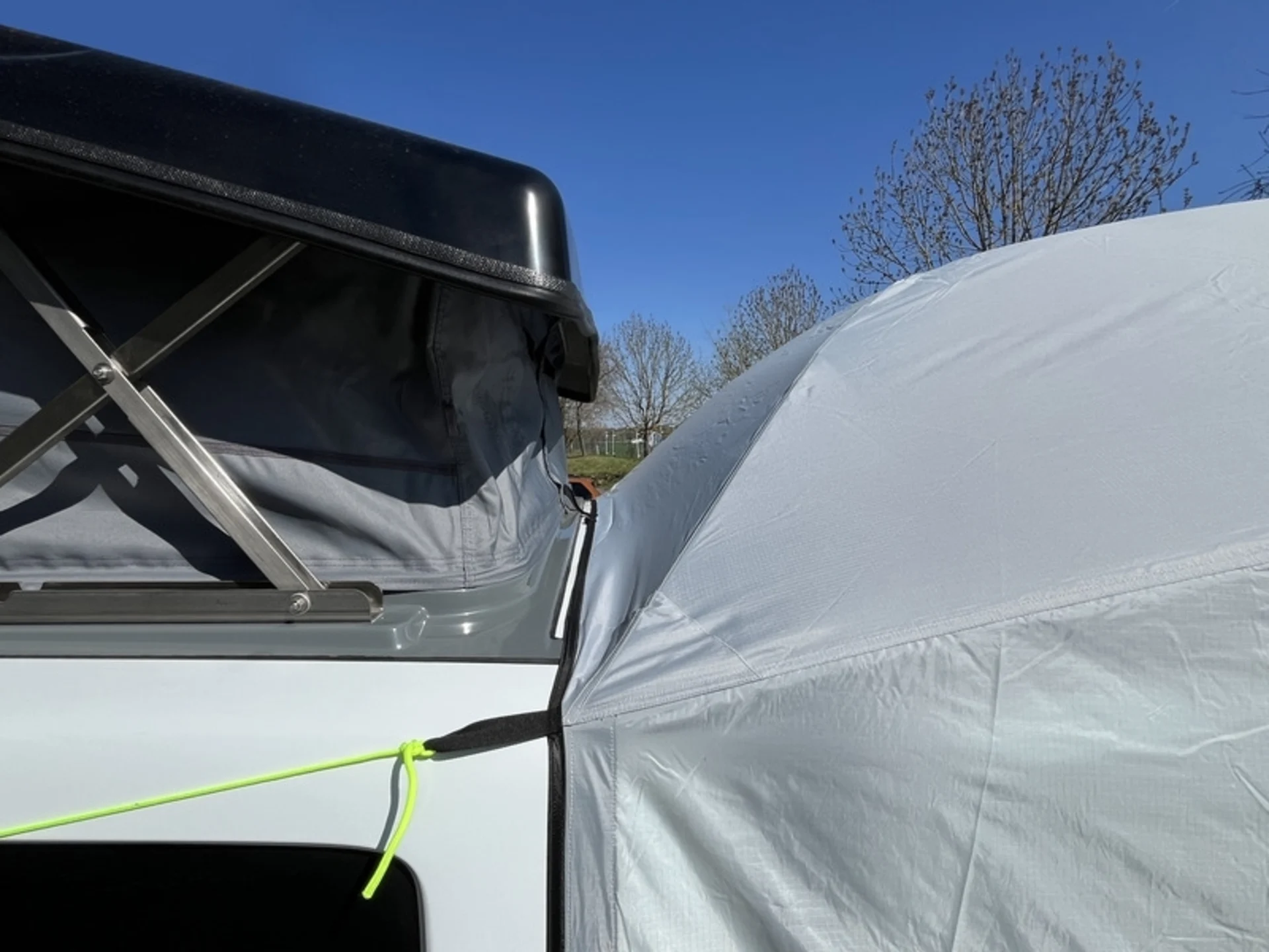 Der Clou beim neu entwickelten Heckzelt UPGRADE DOME PREMIUM: Die Flügeltüren können bei aufgebautem Zelt geschlossen werden. Das Kuppeldach verleiht ein großzügiges Raumgefühl und verhindert gleichzeitig Wassersäcke bei Regen und das U-förmige Stahlrohrgestell verspricht Stabilität. Die Vorderwand besitzt eine große Tür (als Sonnensegel nutzbar) sowie ein transparentes Fenster mit Innenabdeckung und zusätzlichem Moskitonetz. Die Seitenwände mit Ovalfenstern sowie das Oberlichtfenster im Dach gewähren eine gute Rundumsicht. Eine Bodenplane mit integriertem Windschutz unter der Stoßstange, die mit Klett fixiert wird, komplettiert das Zelt.