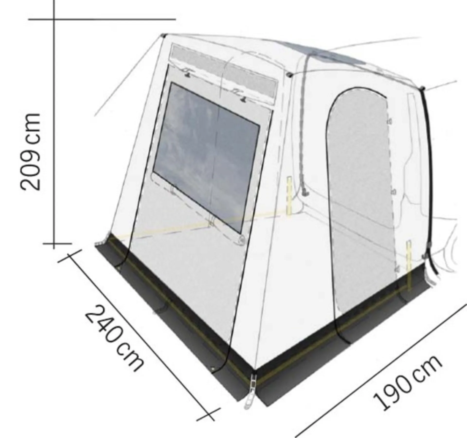 Heckzelt für VW Caddy 5 ab 2021 und Ford Connect 3, das ohne Gestänge auskommt. Es wird einfach über die Heckklappe gezogen und mit angenähten Gurten und Kunststoffhaken fixiert. Die Vorderwand, die auch als Sonnensegel genutzt werden kann ist mit einer großen Reißverschlußtür mit zusätzlichem Moskitonetz ausgestattet. Auch die Seitenwände haben je eine Reißverschlußtür mit einem zusätzlichen Moskitonetz. Das Dach hat ein PVC-Fenster über dem Heckfenster. Die Bodenplane wird per Klett befestigt und ist jederzeit herausnehmbar.