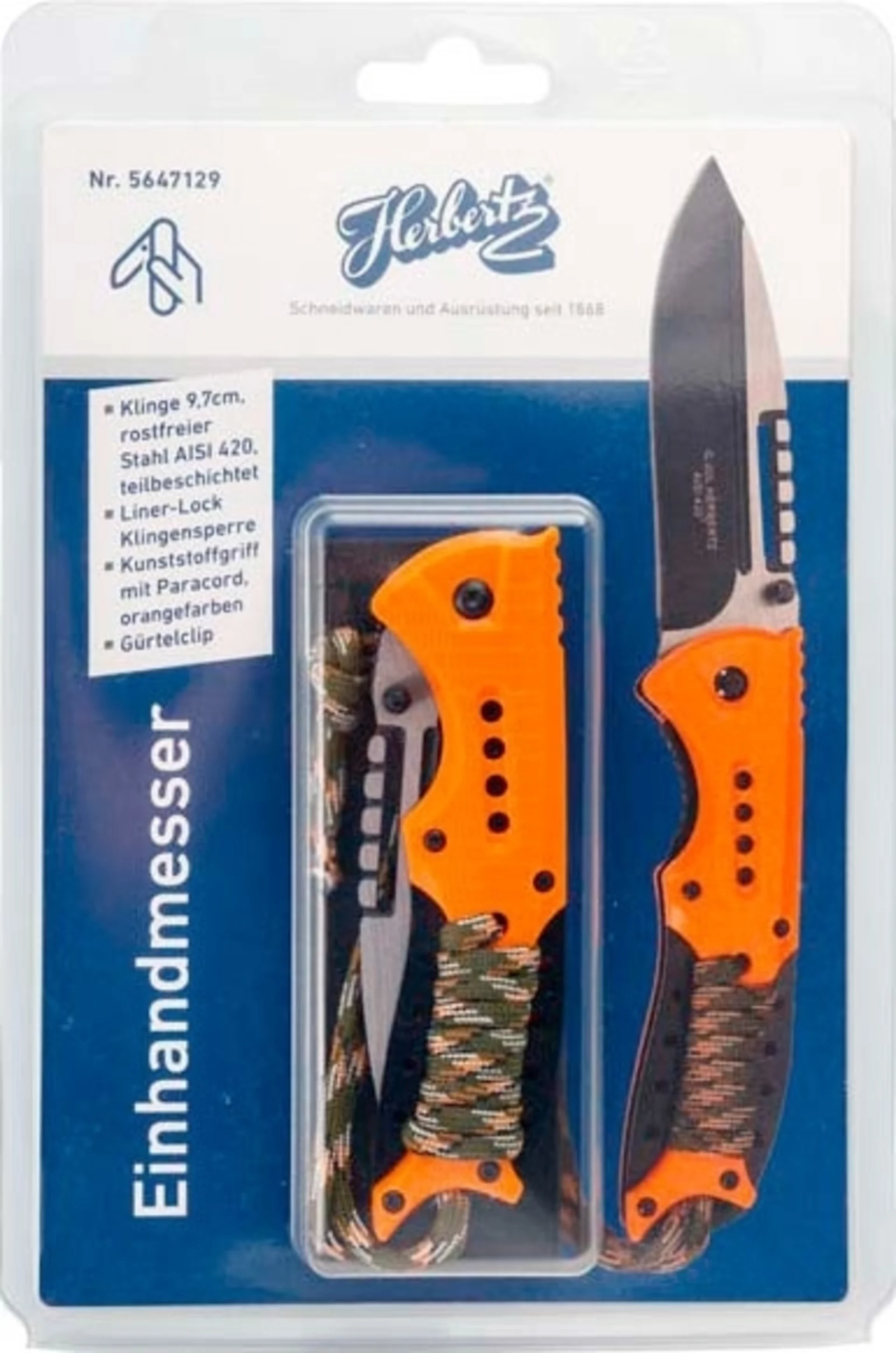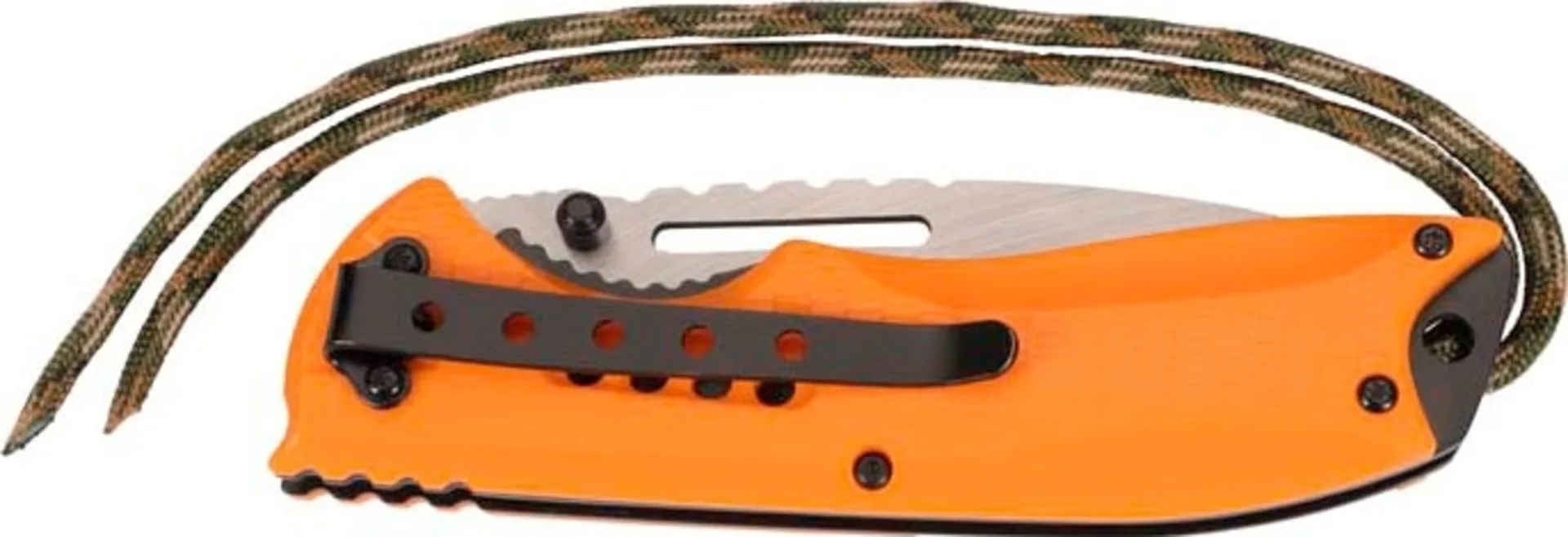 Die Klinge ist zum Teil aus rostfreiem Stahl mit einer schützenden, schwarzen Beschichtung, wie auch der Gürtelclip und die Platinen. Die Kunststoffgriffschalen in einem leuchtenden orange, kombiniert mit einem Paracord bilden hierzu einen deutlichen farblichen Gegenpol. Einfache Arretierung der Klinge mit integriertem Liner Lock-System.