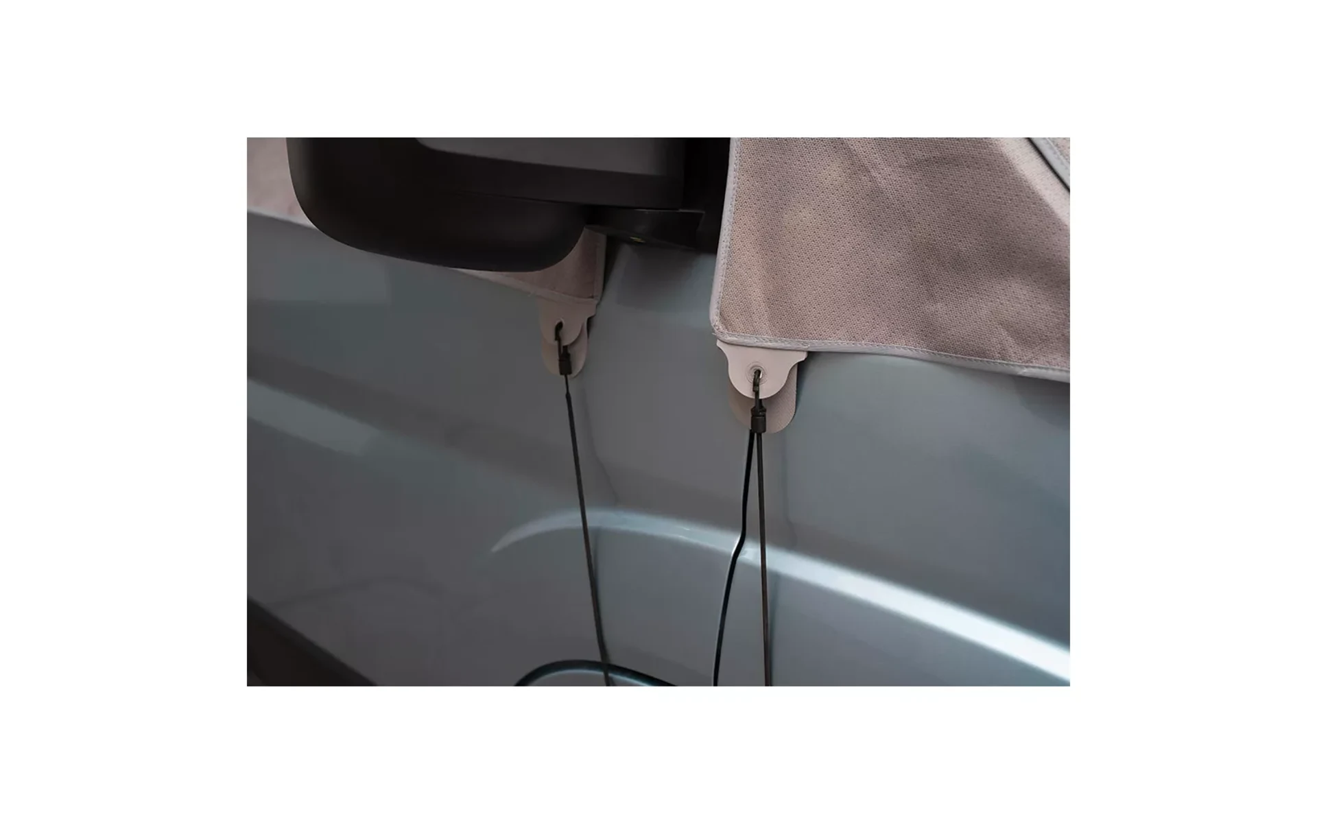 Die Frontschutzplane schützt das Fahrzeug vor Vereisung, Schnee und den Innenraum vor Sonneneinstrahlung und Erwärmung. Dadurch reduziert sich im Sommer die Innenraumtemperatur. Bei dieser Ausführung werden die Seitenscheiben ebenfalls geschützt um unerwünschte Einblicke in das Fahrzeug zu verhindern.Die Frontschutzplane schützt die Fahrzeuglackierung vor Ausbleichen und Verunreinigungen. In beiden Türbereichen befinden sich Innentaschen, die einfach über die Türkanten eingehängt werden. Entlang der Unterkante befinden sich Abspannlaschen mit verstärkten Kunststoffösen. Zum Schutz vor Reibung auf der Lackierung sind Schutzlaschen verarbeitet. Die auf das Fahrzeug abgestimmten Spiegelausschnitte gewährleisten eine passgenaue Form.