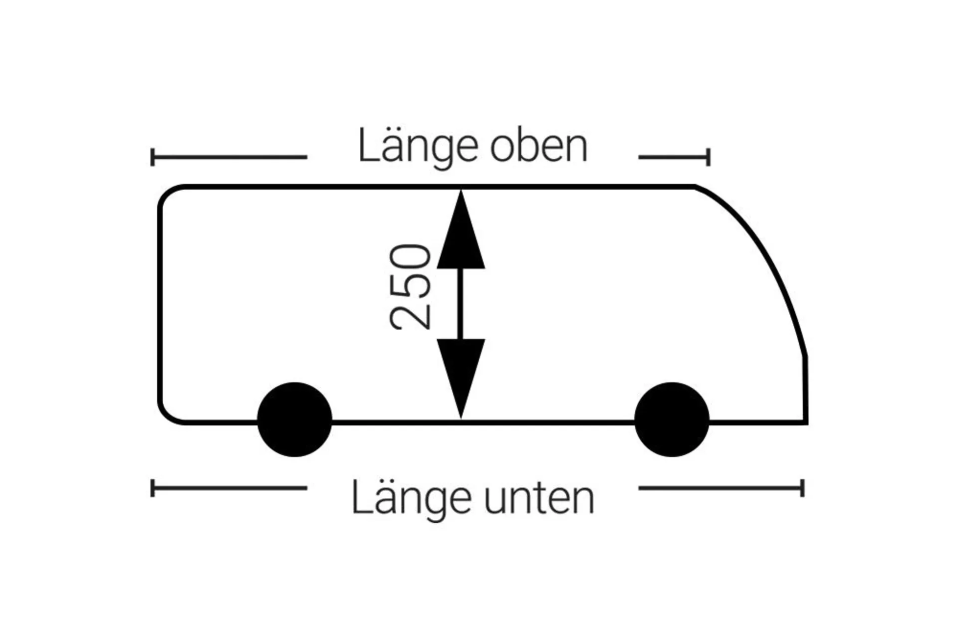 Die Höhe der Haube ist immer circa 35 cm geringer als die gesamte Fahrzeughöhe. Berücksichtigen Sie alle Überstände wie z. B. den Fahrradträger. Geringfügige Maßtoleranzen vorbehalten.
