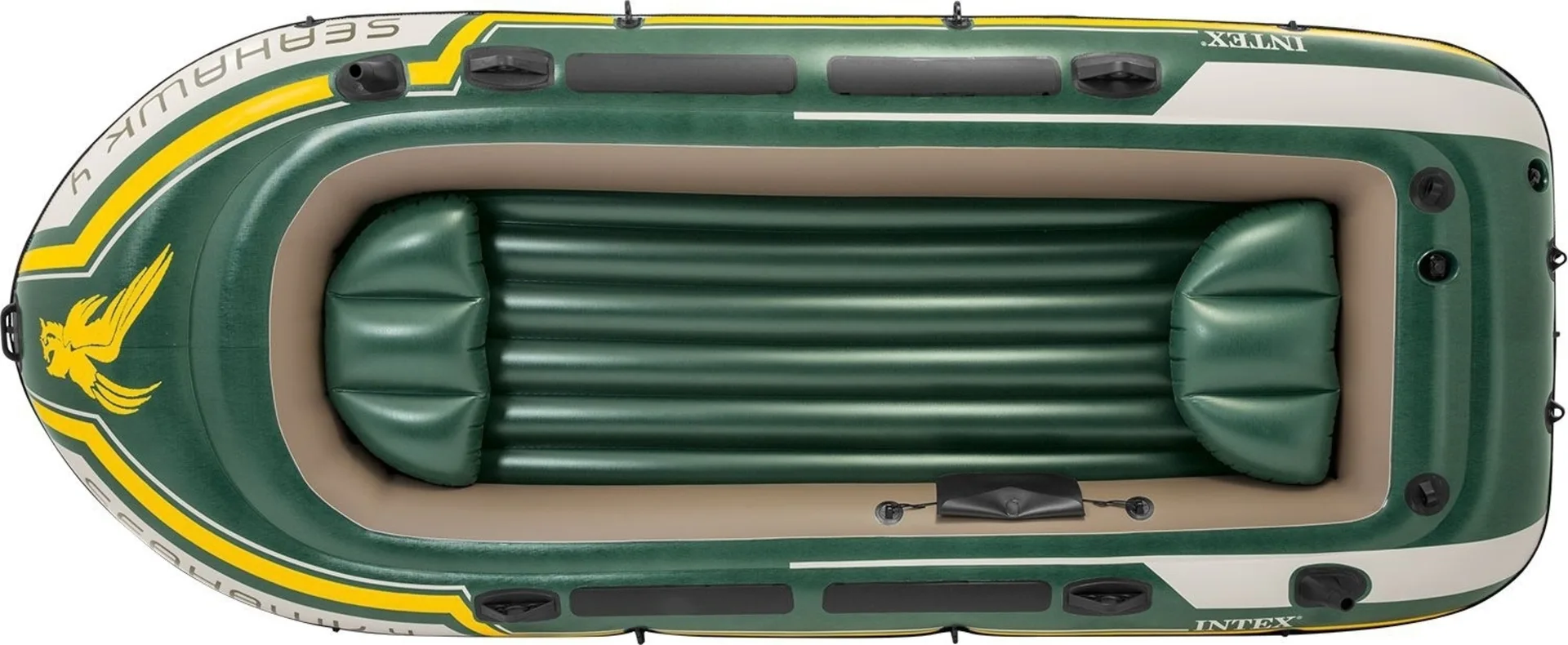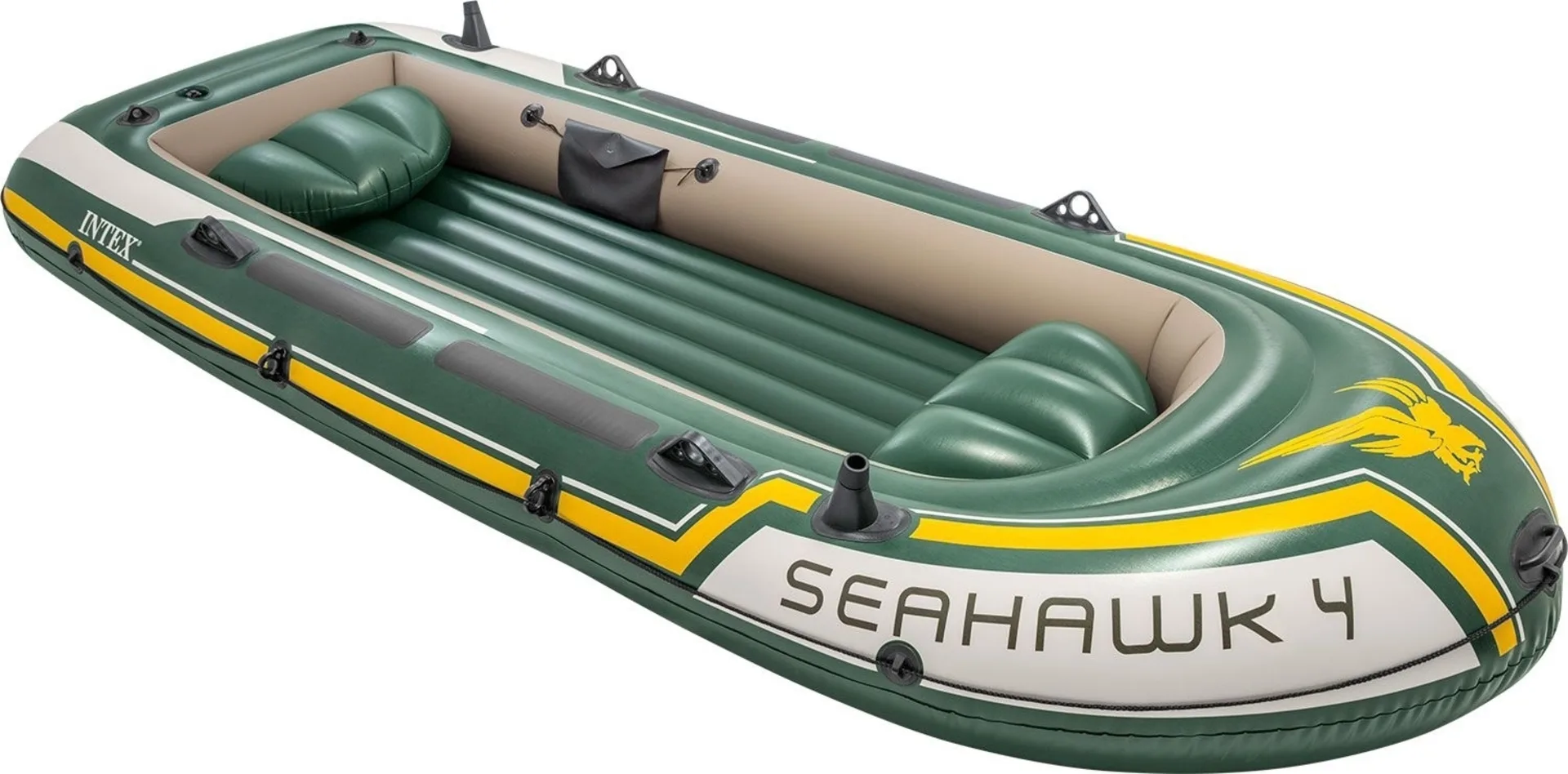 Die Angelhalterungen an beiden Seiten sind ideale Voraussetzungen für Angelausflüge. Für den einfachen Transport ist eine Halteleine rund um das Boot vorhanden. Das Schlauchboot besteht aus stabilem Material (100% Polychlorid) und wird mit aufblasbaren Kissen (bei Größe 3 und 4), zwei hochwertigen Aluminium-Paddel, einer Handpumpe und einem Reparaturset geliefert. Eine Zubehörtasche zum Verstauen von Equipment ist ebenso im Lieferumfang enthalten.