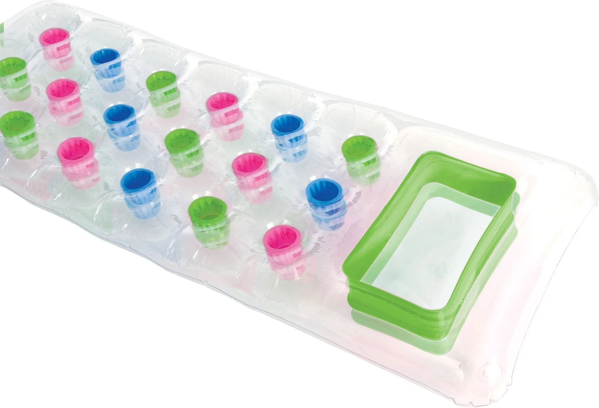 Entspanntes Sonnenbaden auf dem Wasser. Mit der 188 x 71 cm großen Luftmatratze „18-Pocket Suntanner Mat“ von Intex im transparenten Design mit bunten Taschen ist das möglich. Das integrierte Kopfkissen, zwei Luftkammern und ein 0,28 mm starkes Vinyl sorgen für Festigkeit und angenehmen Liegekomfort.