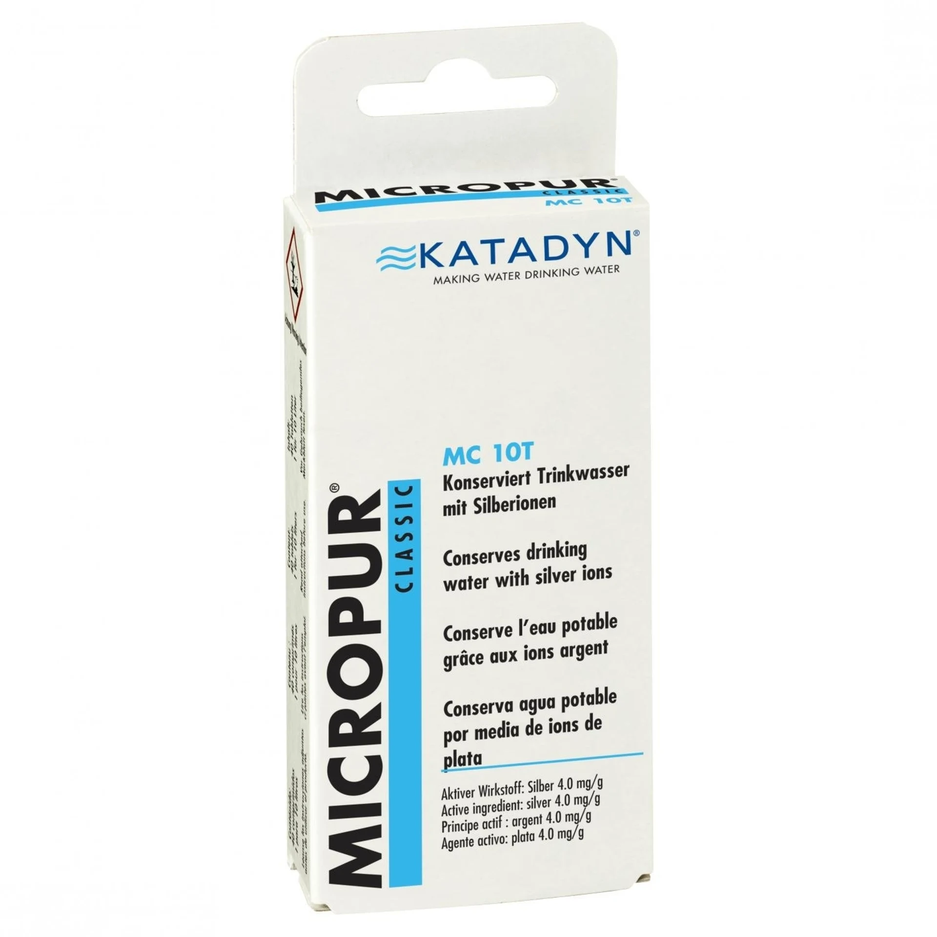 Katadyn Micropur Classic MC 10T (Tabletten) - einfache Konservierung von Leitungswasser. Alle verwendeten Inhaltsstoffe sind für den Gebrauch im Trinkwasser zugelassen. Im Unterschied zu Chlor, das nur wenige Stunden in Wasser wirkt, machen Silberionen klares Trinkwasser bis zu 6 Monate haltbar. Wirkt bakerizid nach 2 Stunden Kontaktzeit. In südlichen Ländern und den Tropen unentbehrlich für die Erhaltung der Gesundheit!