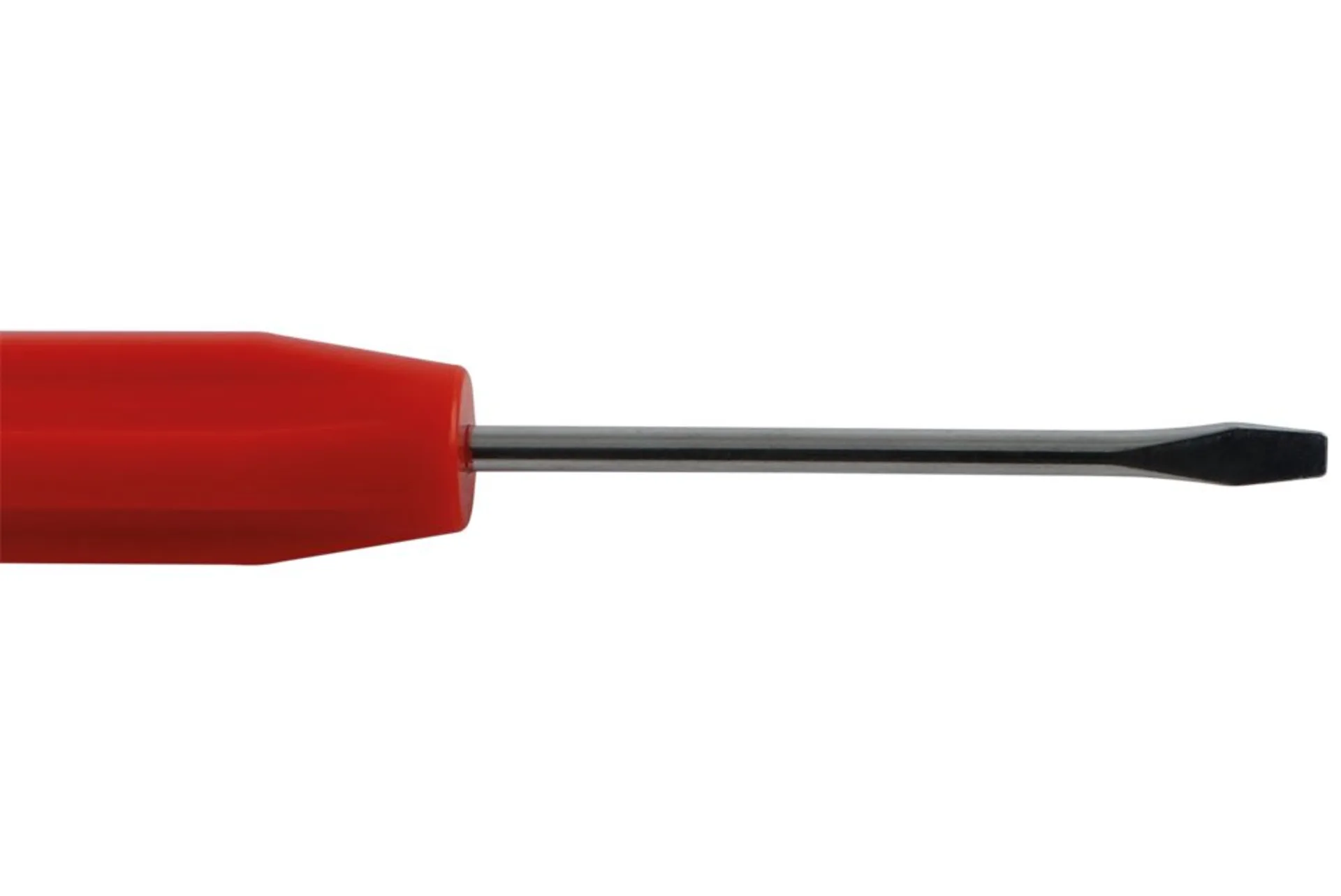Eine Seite mit Haken, andere Seite Schraubenzieher (3mm), Kunststoff-Griff.