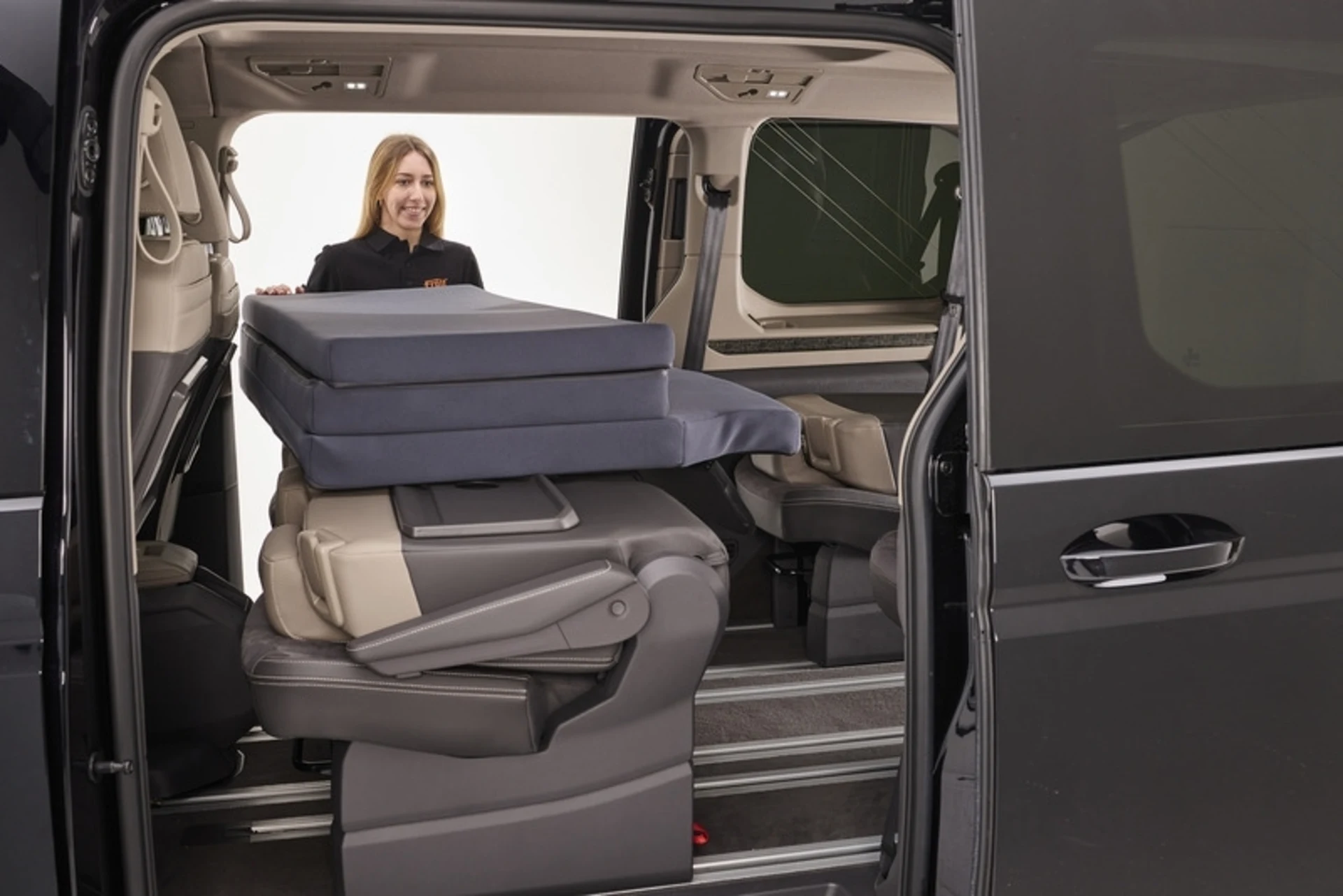 Das Schlafmodul wird im Heck des Fahrzeugs platzsparend zusammengeklappt. Der Polsteraufbau bietet sehr guten Schlafkomfort und Druckentlastung. Ideale Ergänzung für Kurzreisen in einem VW Multivan >2021.