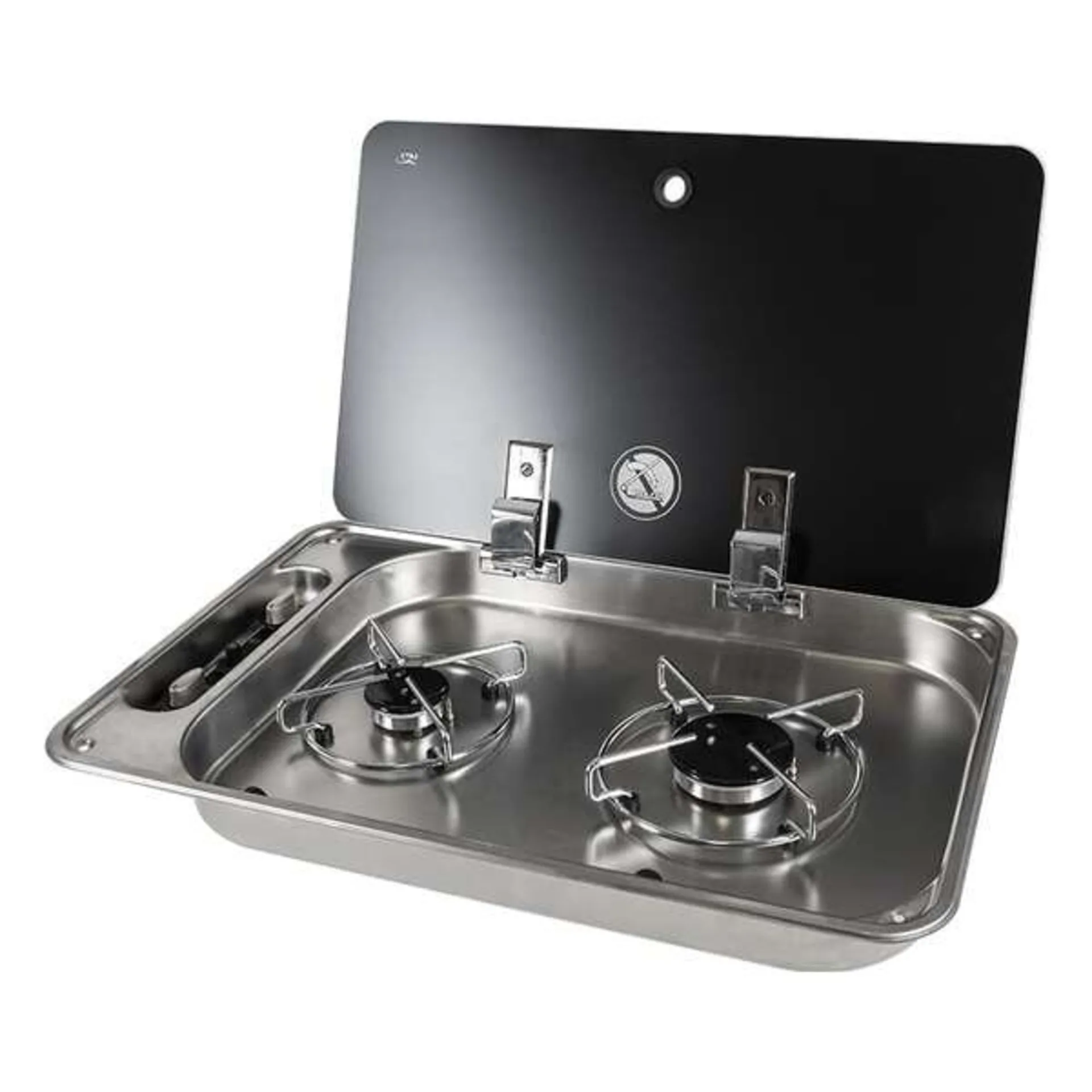 2-flammiger Kocher 30 mbar rechteckig, aus Edelstahl mit schwarzer Glasabdeckung. Schönes Design und perfekte Verarbeitung, ideal geeignet für den Einbau in kleinere Reisemobile, Caravans oder Busse.