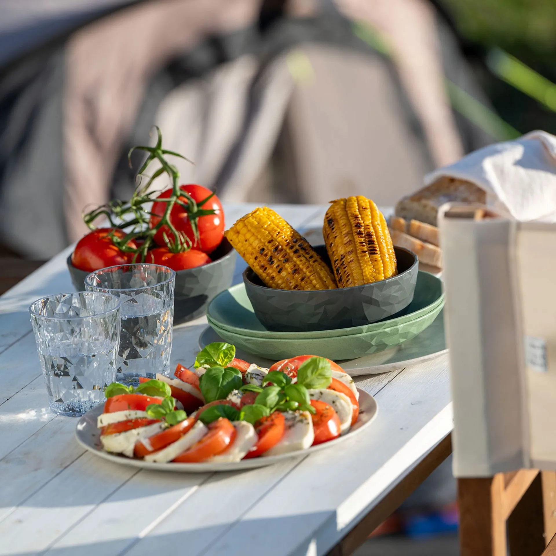 Ideal für alle Outdoor-Aktivitäten, bei denen man auf stilvolles Geschirr keineswegs verzichten möchte. Abgerundet wird das 16-teilige Set durch vier formschöner Trinkbecher. Wasser, Longdrinks, Säfte oder Limonade – dieser Becher kann wirklich alles! Damit wird er in- und außerhalb des Hauses ganz schnell zum Vierjahreszeiten-Universaltalent, das zudem mit seiner faszinierenden Facettenstruktur viel Leben auf Tisch und Tafel bringt. Seine organische Haptik der Außenseite lässt sich auch von Kinderhänden sicher greifen – und sollte er doch einmal herunterfallen, bleibt er ganz! Da man unter diesen Voraussetzungen eigentlich nie genug Exemplare von CLUBL haben kann, macht sich das Glas im Küchenschrank durch ideale Stapelbarkeit ganz besonders schlank.