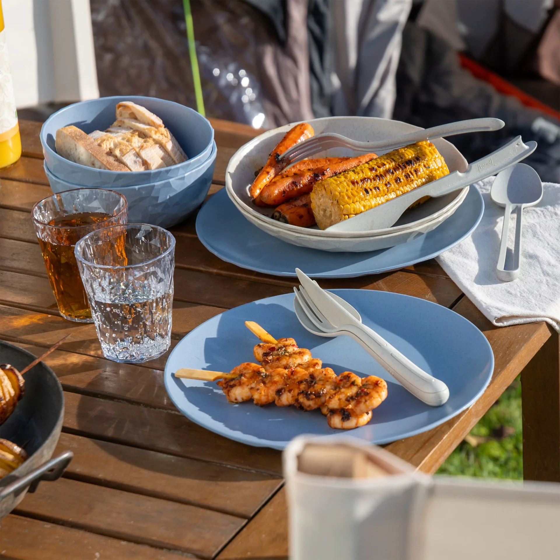 Das Geschirrset ist aus umweltfreundlichem thermoplastischem Kunststoff hergestellt und bringt frischen Wind in jeden Outdoor-Lunch oder Terrassen-Dinner und hält auch turbulenten Feiern ohne jeden Scherbenhaufen stand. Die solide Materialität und die modernen Farben vermitteln stets das gute Gefühl eines schön gedeckten Tisches. Das Material bleibt lange schön und ist natürlich spülmaschinenfest.