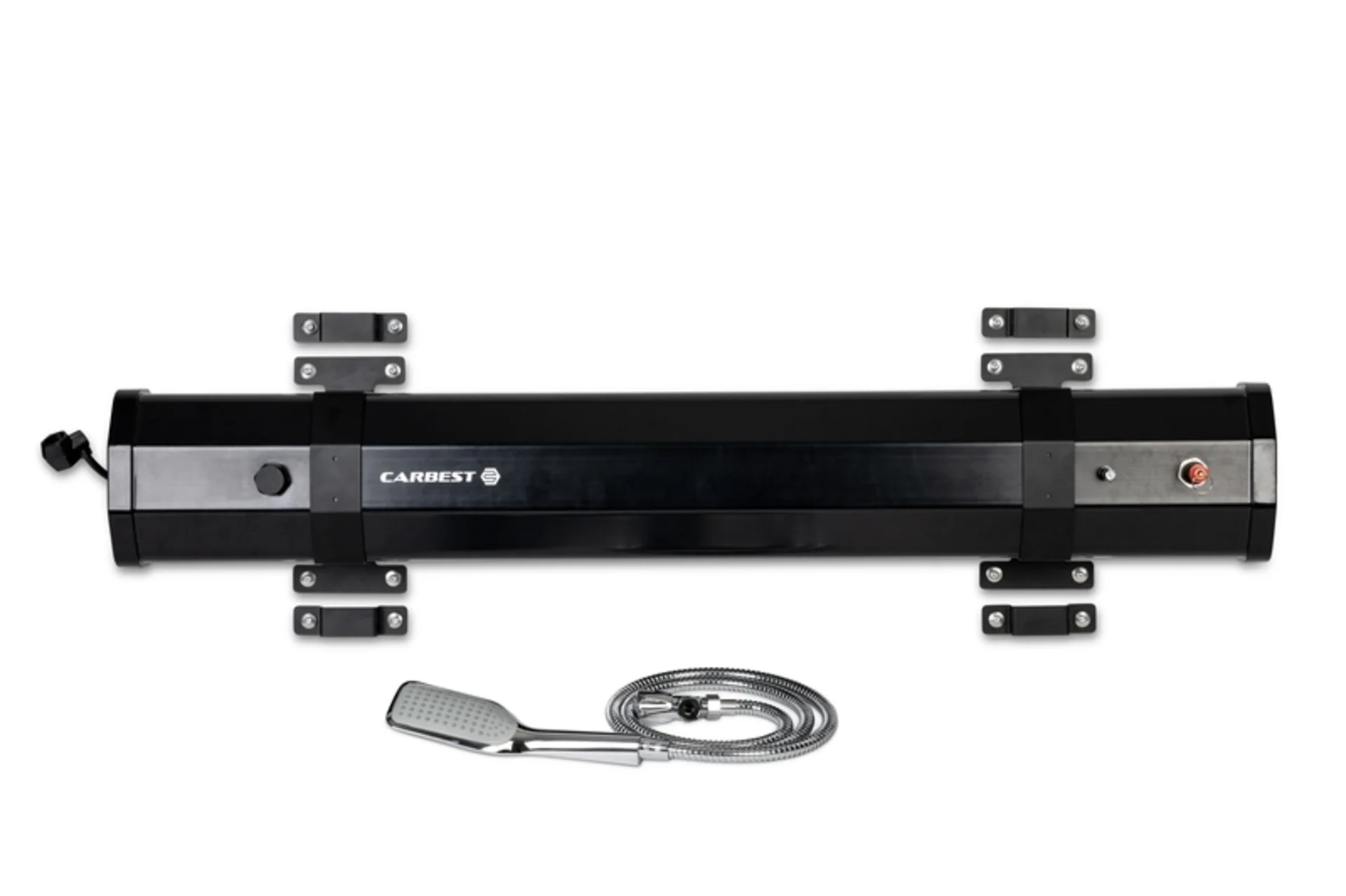 Diese hochwertige Außendusche aus lebensmittelechtem PVC bietet 20 Liter Fassungsvermögen und sorgt für eine erfrischende Dusche im Freien. Sie lässt sich fl exibel mit einem Kompressor oder einer Fahrradpumpe betreiben und kann mit einem Standard-Gartenschlauch befüllt werden. Der elegante Chrom-Duschkopf und der 1,5 Meter lange Schlauch bieten optimalen Komfort. Dank der Konushalterung mit Klebepad kann die Dusche sicher befestigt werden. Mit dem beiliegenden Universal-Montageset lässt sich die Dusche an nahezu jedem Dachträger anbringen – perfekt für Campingausfl üge und unterwegs. Schnellöff nungsventil für einfache Handhabung. Maße: 113 x 18 x 14,5 cm, inkl. Universal-Montageset für Dachträger. Lieferbar ab Q2/2025.