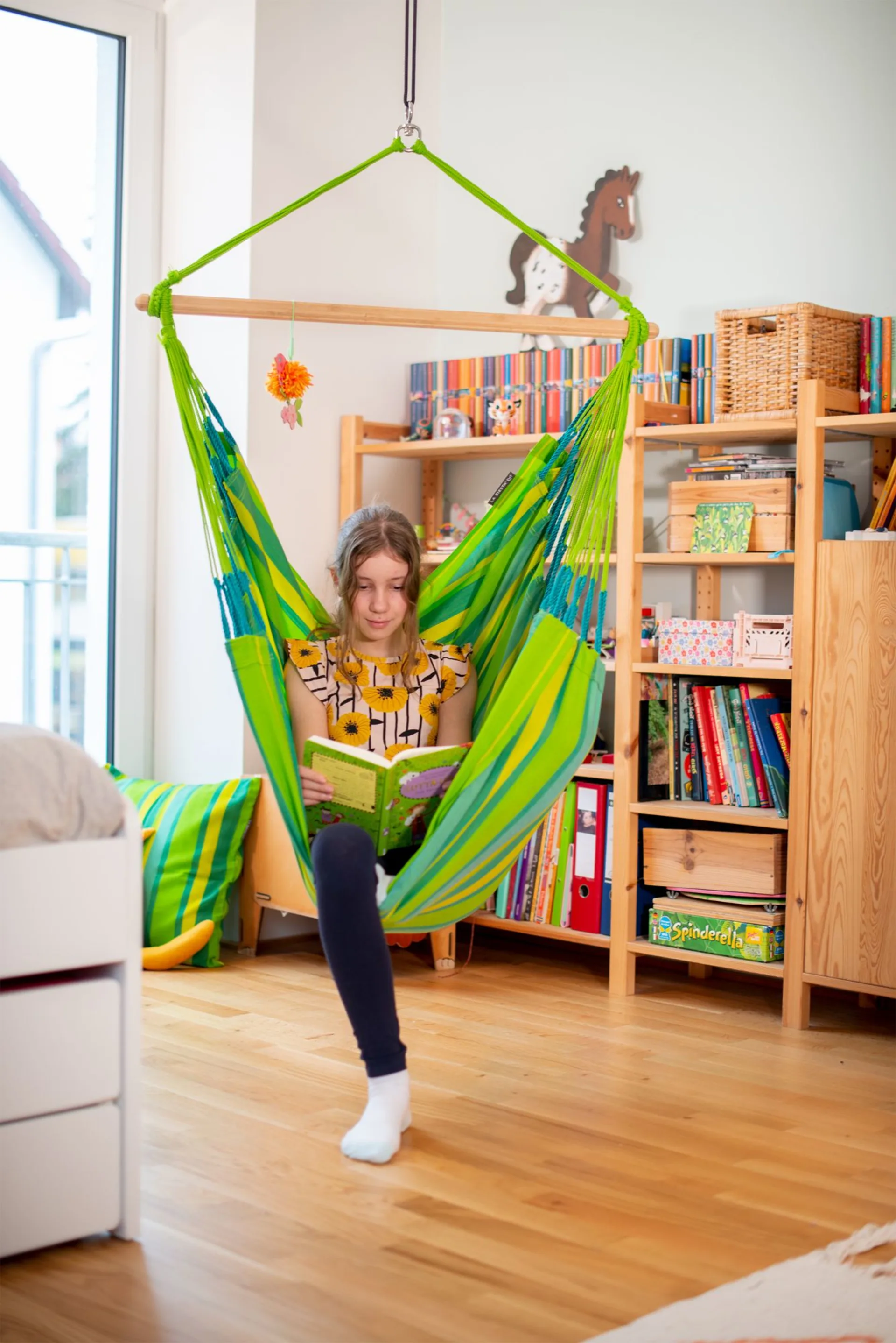 Die Qualität eines Hängesessels bemisst sich an der Anzahl seiner Aufhängeschnüre. Viele Schnüre bewirken eine bessere Gewichtsverteilung und erhöhen so Langlebigkeit und Komfort des Hängesessels. Nach traditionellem Kunsthandwerk in Kolumbien gefertigt. Hochwertig, bequem und wunderschön. Durch die Verdoppelung der Schussfäden sind die Webkanten verstärkt und dadurch besonders reißfest. Dank speziellem Drehwirbel kannst du dich in deinem Hängesessel angenehm und sicher um 360° drehen ohne dass die Aufhängeschnüre mitdrehen.