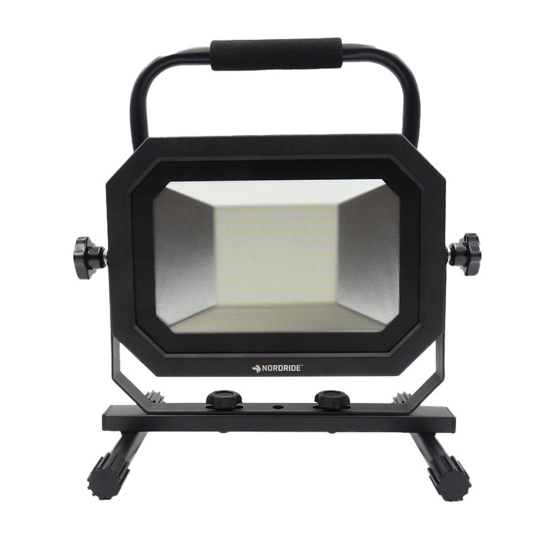 LED-Baustrahler mit auf robustem Ständer; dank seitlicher Entblendung (prismatischer Diffusor) hat der Strahler eine gleichmässige Ausleuchtung und dies in angenehmen 4'000 K (neutralweiss).