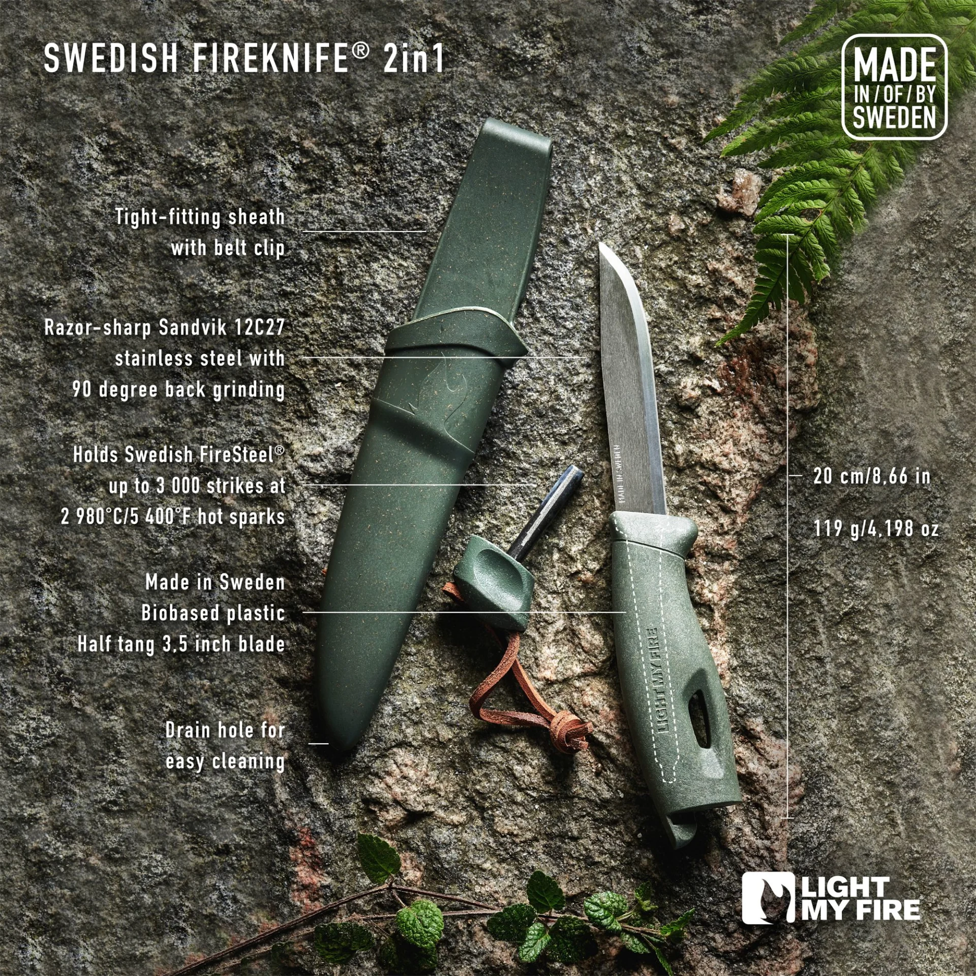 - Allwettertauglicher schwedischer FireSteel: bis zu 3000 Zündschläge bei 3000°C