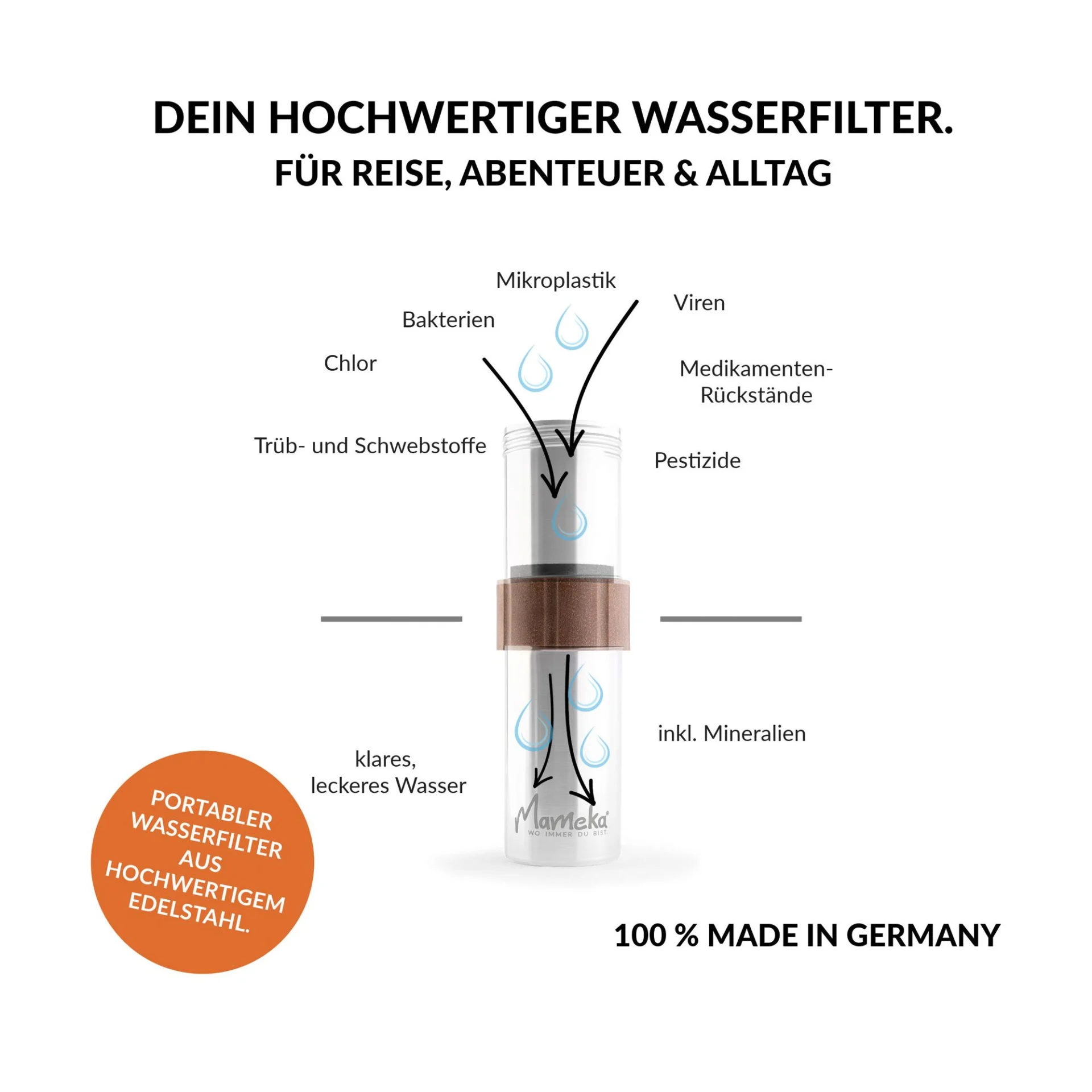 Filtere weltweit Leitungswasser, Brunnen, Fließgewässer wie Flüsse oder Bachläufe, Wasser aus dem Brauchwassertank etc. Ist die Filterkapazität langsam erschöpft, lässt die Durchflussrate nach - das Filtern dauert länger. Filterblock einfach austauschen und alten Filter im Hausmüll entsorgen.