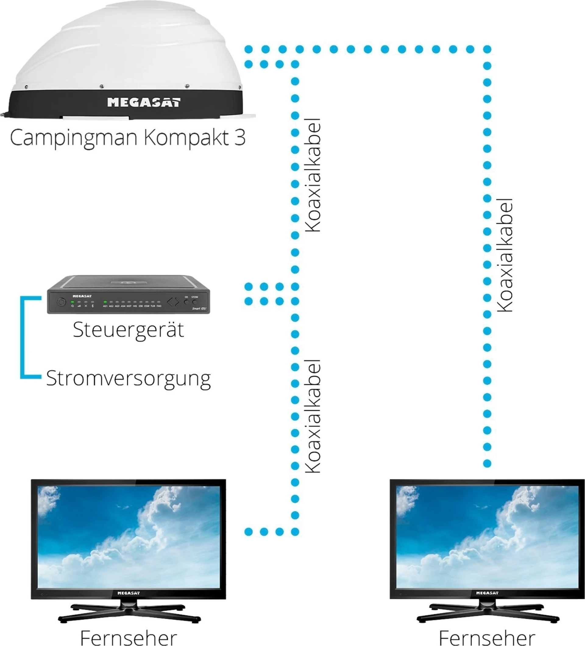Das Steuergerät bietet ein integriertes Bluetooth-Modul, um sich mit Ihrem Smartphone oder Tablet zu verbinden. Somit können zukünftige Firmware-Updates bequem über das Smartphone aktualisert werden. Die kostenlose App ist für iOS und Android erhältlich. Die Auswahl des Satelliten erfolgt wahlweise am Steuergerät oder über die App auf dem Mobilgerät. Die Satelliten-Antenne ist geeignet für einen oder zwei Teilnehmer (je nach Ausführung) und wird mit nur einem Koaxialkabel mit dem Steuergerät verbunden.