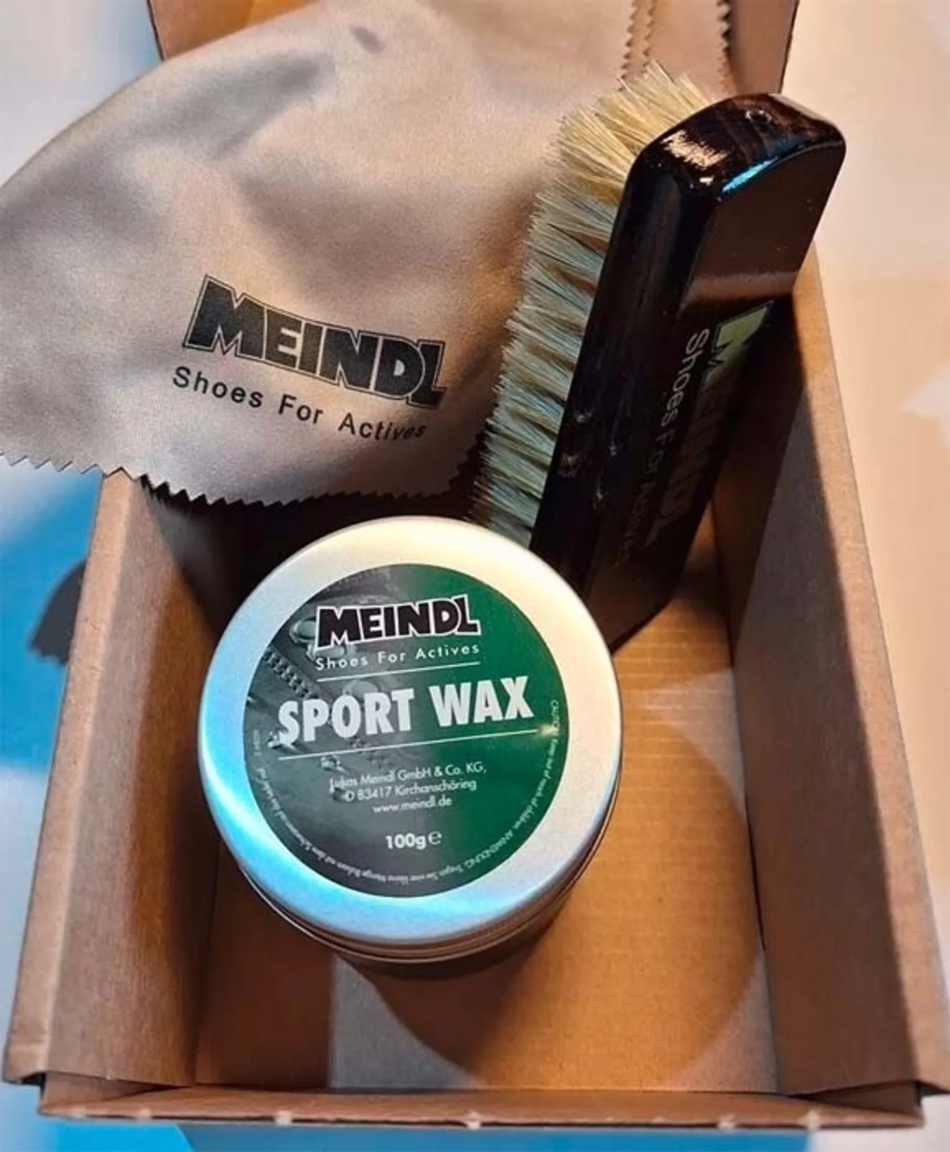 Meindl Pflegemittel-Set bestehend aus 100g Sport Wax, Microfaser Putztuch und Polierbürste.