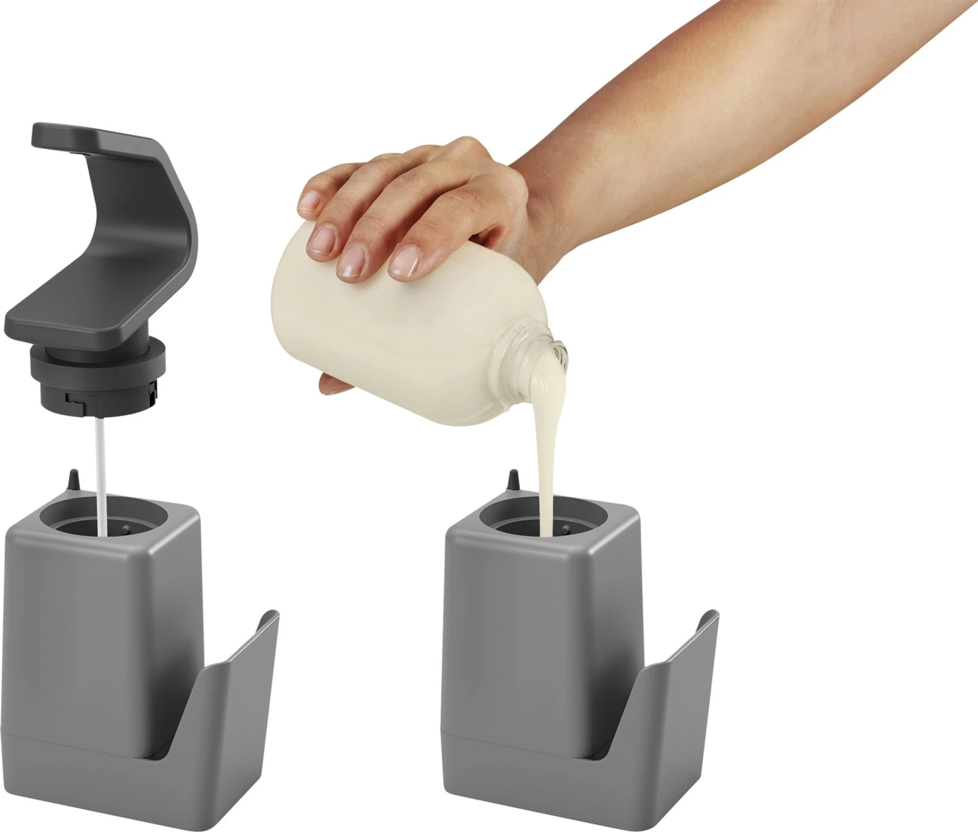 Der Spender lässt sich ganz einfach immer wieder befüllen und zur hygienischen Verwendung mit dem Handrücken betätigen. Der Spender ist ausgestattet mit einem praktischen Schwammhalter, cleverem Ringhalter und Anti-Rusch-Boden.