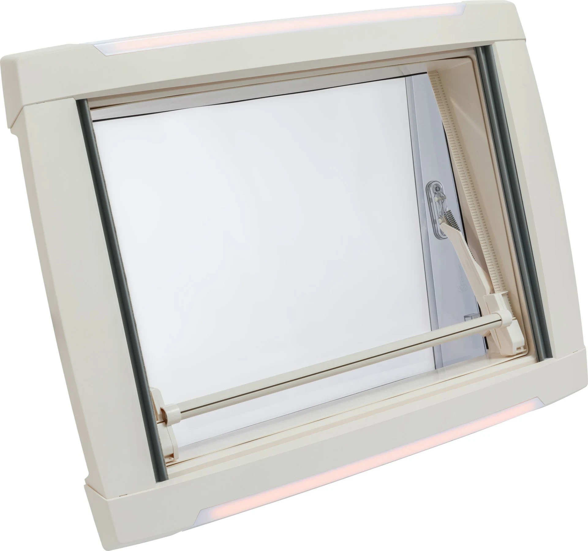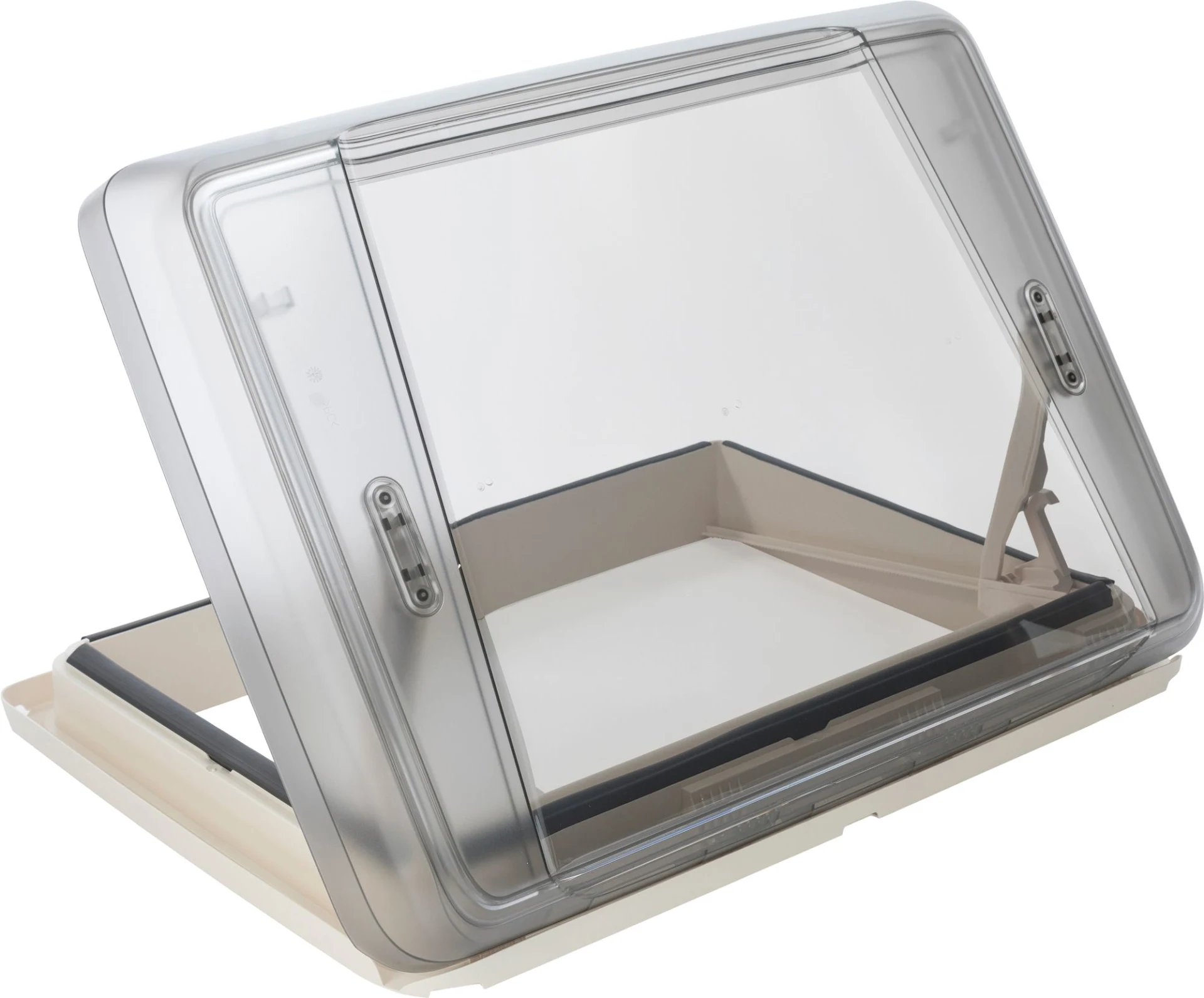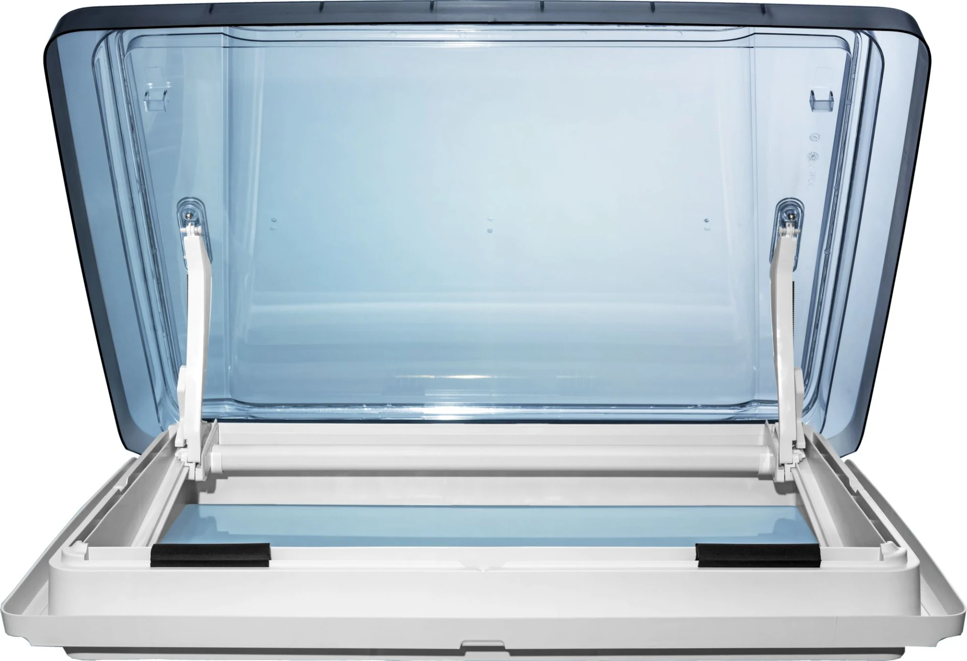 Die VisionStar L Pro Rauchglas Dachhaube von MPK mit Doppelverglasung aus schlagzähem Polycarbonat mit modernen Design. Dank der flachen Haube, sind die Fahrgeräusche im Inneren sehr gering. Die einfache Einhand-Bedienung mittels Bügelgriff erlaubt eine stufenlose Aufstellung bis zu 55°. Bei Betätigung de Aufstellmechanismus ver- und entriegelt die Haube automatisch. Der doppelwandige Außenrahmen sorgt für eine bessere Isolation. Der Innenrahmen mit Doppelplissee schützt zuverlässig vor Sonneneinstrahlung und Insekten. Rauchglashaube für einen besseren UV-Schutz. Dauerlüftung bis zu 150 cm².