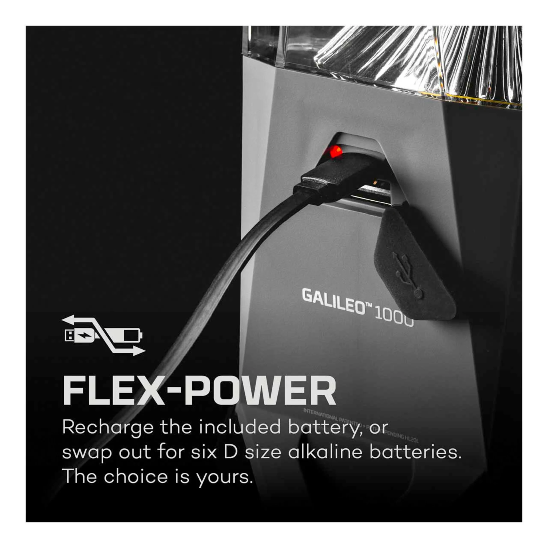 Bei der GALILEO 1000 kann Dank Flex-Power, die Laterne alternativ auch mit 6x D-Cell Batterien betrieben werden.