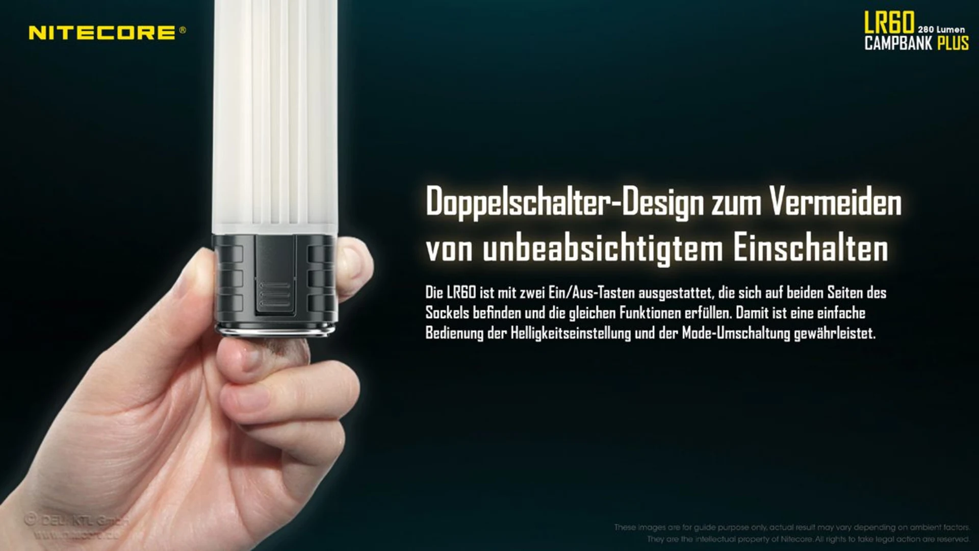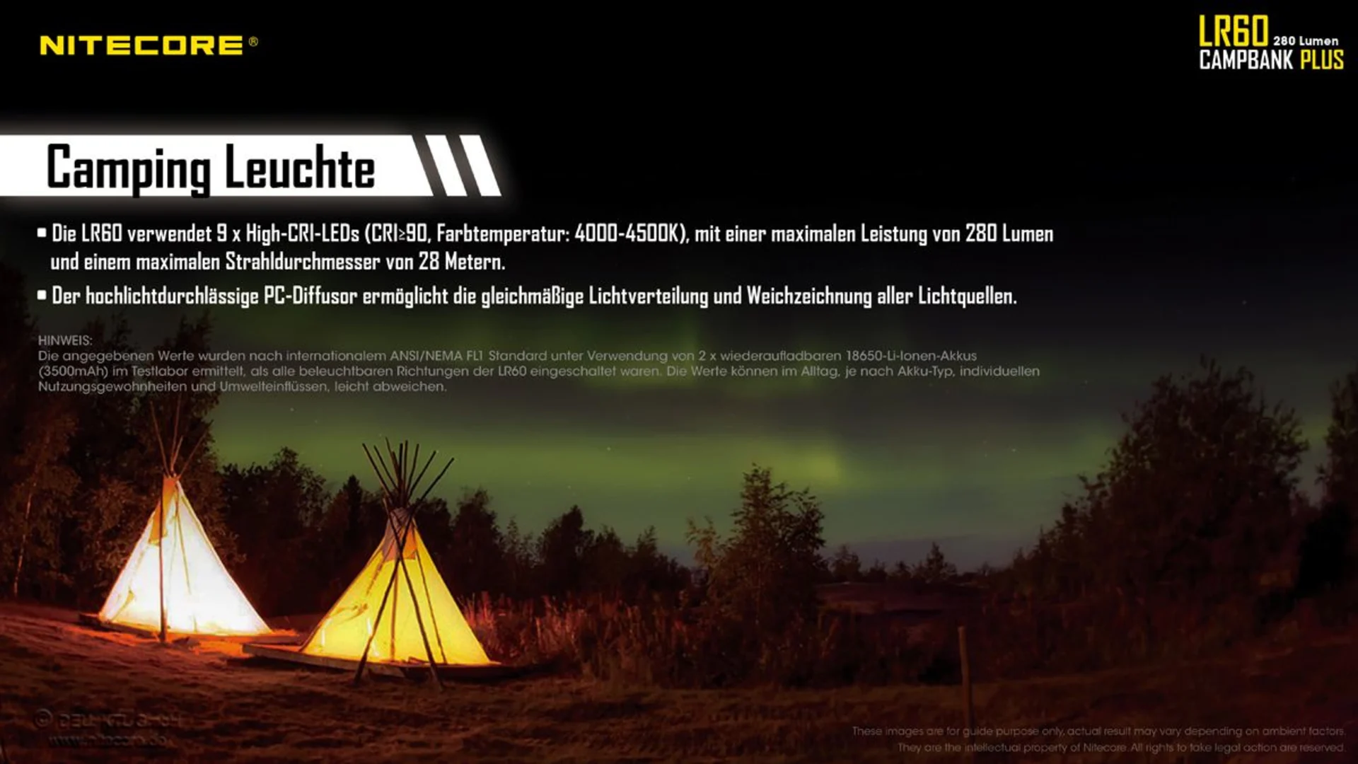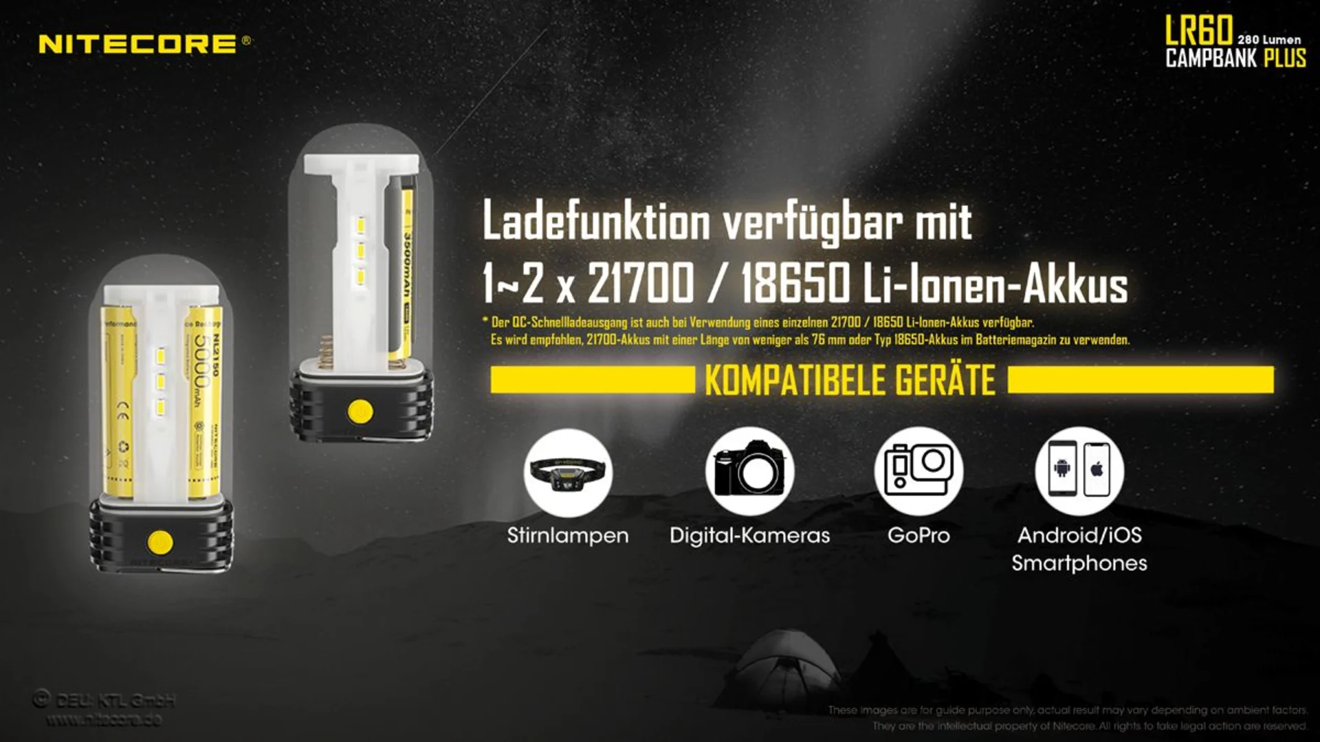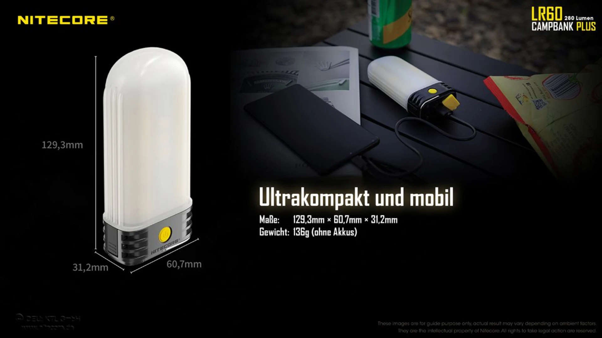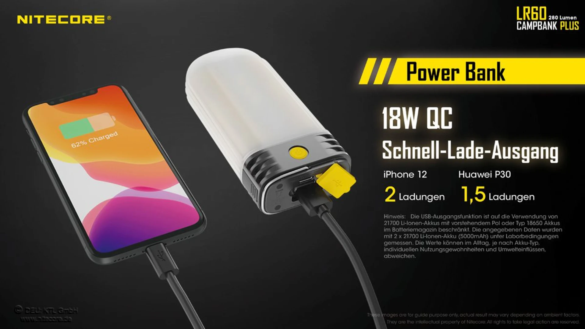 Lieferumfang: Nitecore LR60, Ladekabel, Batteriemagazin für 18650 Li-Ion Akku, Bedienungsanleitung