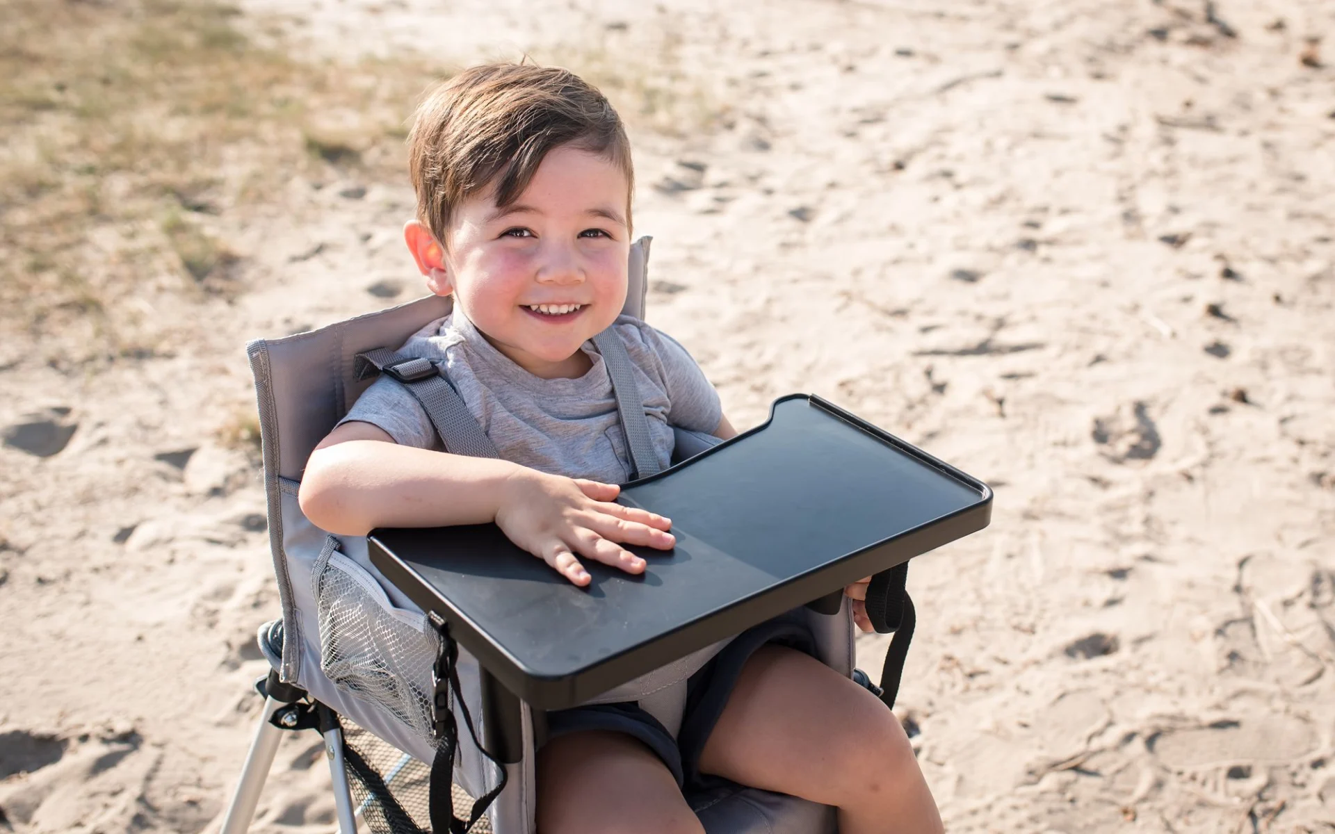 Dieser superleichte Kinderhochstuhl mit integriertem Esstisch ist der perfekte Camping-Reisebegleiter für Familien mit Babys (ab 6 Monaten) und Kleinkindern (bis 3 Jahre). Er ist in einem praktischen Tragebeutel verpackt und lässt sich sekundenschnell entfalten. Mit einer Sitzhöhe von 60 cm kann er ganz einfach an den Tisch geschoben werden. Das Gestell ist aus Aluminium, der pflegeleichte Bezug ist komplett abnehmbar und bei 30°C waschbar (im Schonwaschgang).