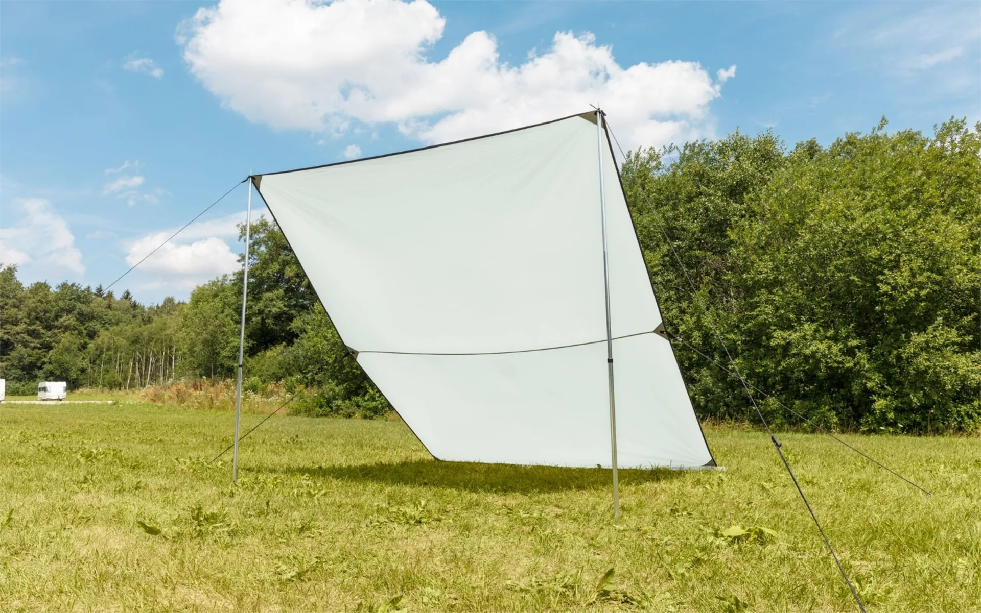 Durch die verschiedenen Aufbaumöglichkeiten, wie zum Beispiel das befestigen an einem Bus mit dem integrieten Keder oder als freistehndes Sonnensegel mit zwei verschiedenen Aufstellstangen. Durch die Aufstellstangen kann die Höhe optimal angepasst werden.