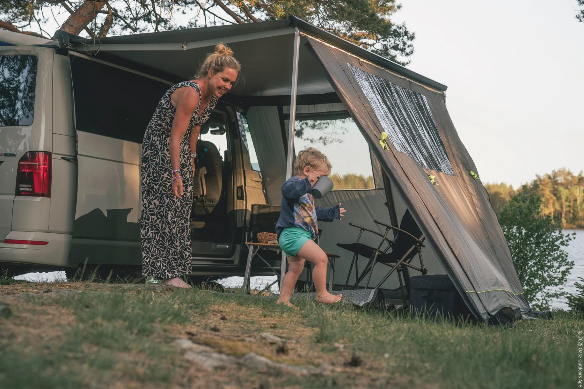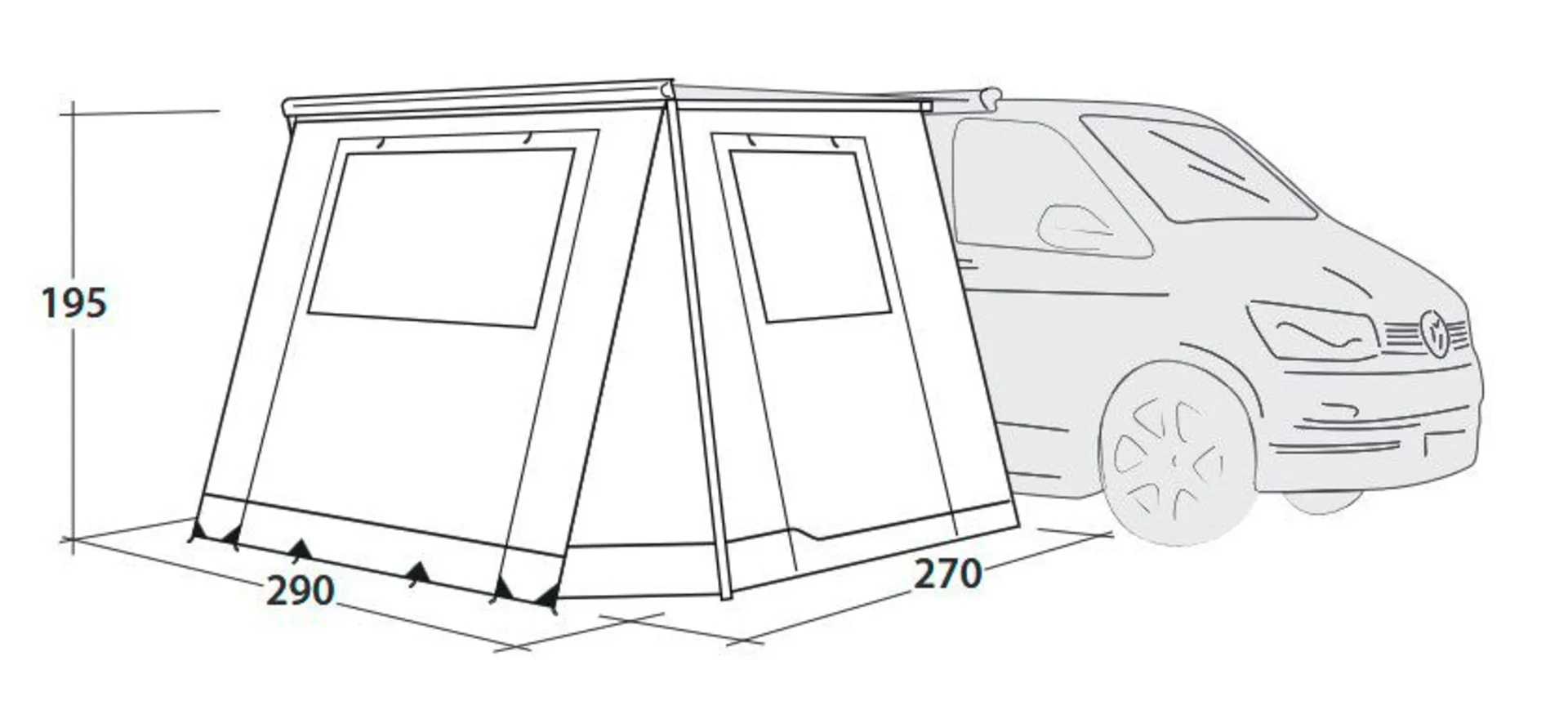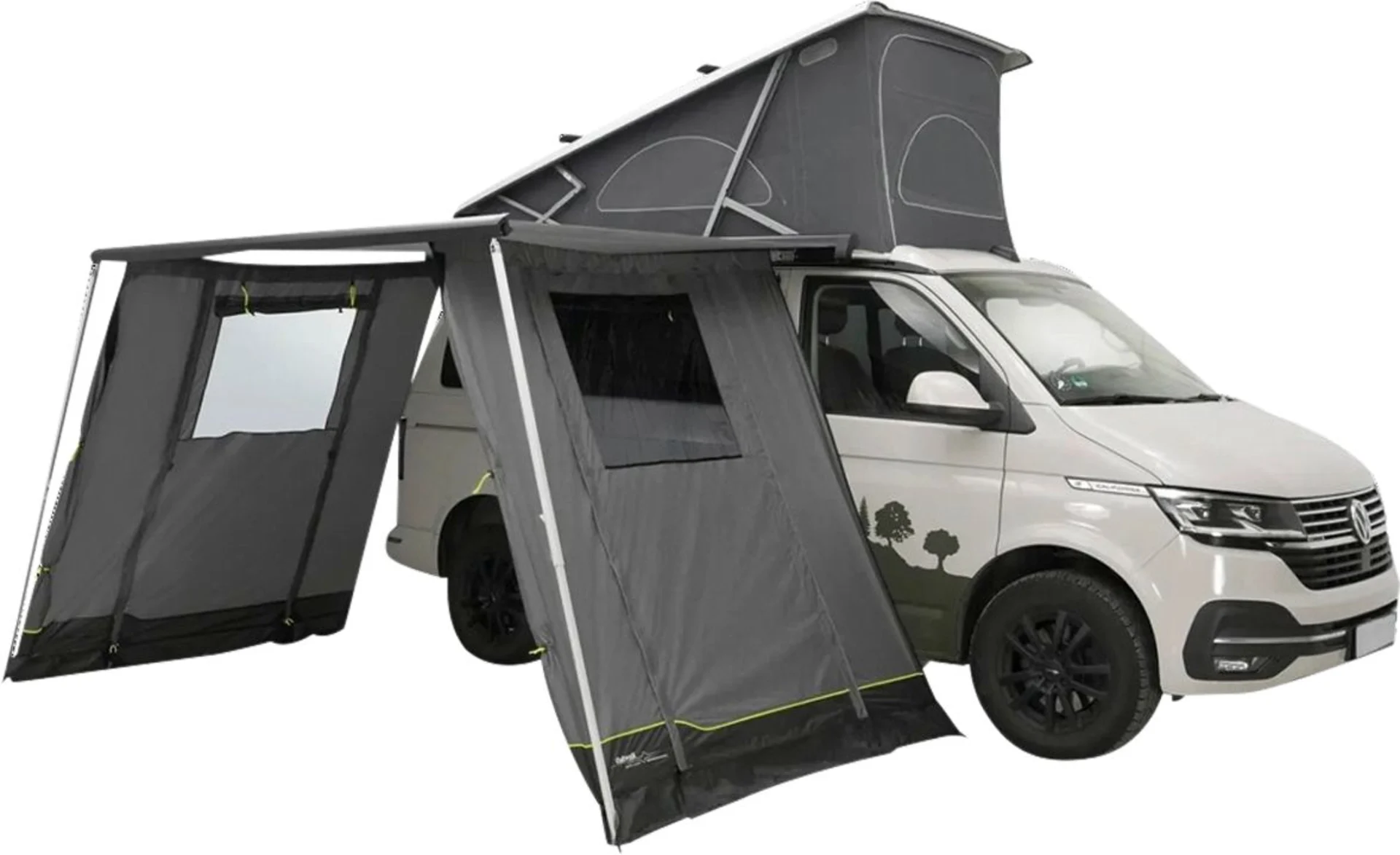 Das Outwell Backroads Awning Room bietet eine praktische Möglichkeit, den Wohnbereich unter der Bus-Markise zu erweitern. Es bietet Schutz vor Sonne, Regen, Wind und gibt mehr Privatsphäre. Das Vorzelt wird direkt an der vorhandenen Markise des Fahrzeugs befestigt, die als Dach dient. Es besteht aus einem Set mit zwei Seitenteilen und einer Front, die schnell zu montieren sind und alle Teile sind auch einzeln nutzbar. Große, getönte Fenster in allen Seiten sorgen für Tageslicht und Ausblick, während sie gleichzeitig die Privatsphäre wahren. Idealerweise in zwei Taschen verpackt, die beim VW California oder Ford Nugget zu den Stühlen in der Heckklappe passen.