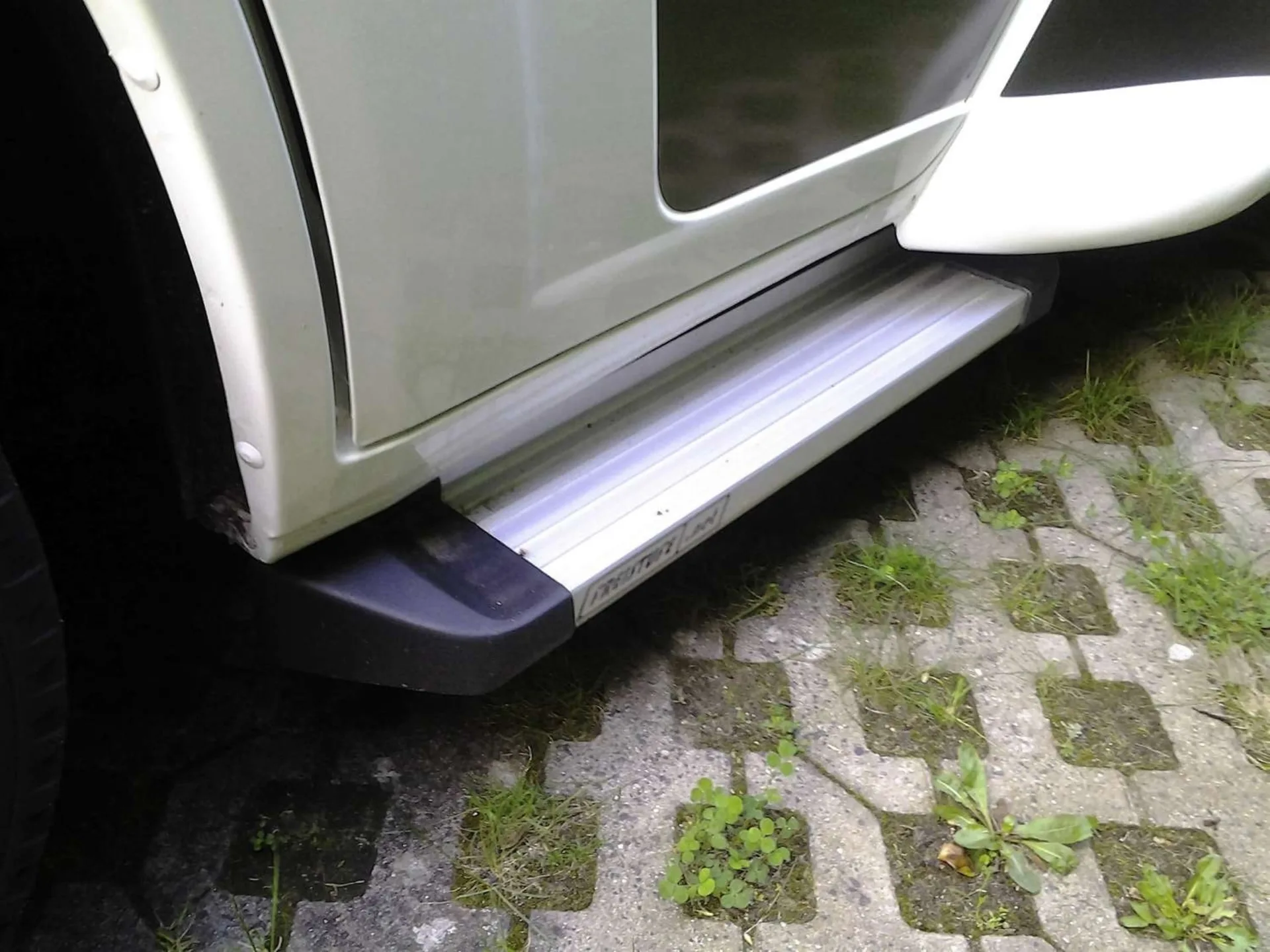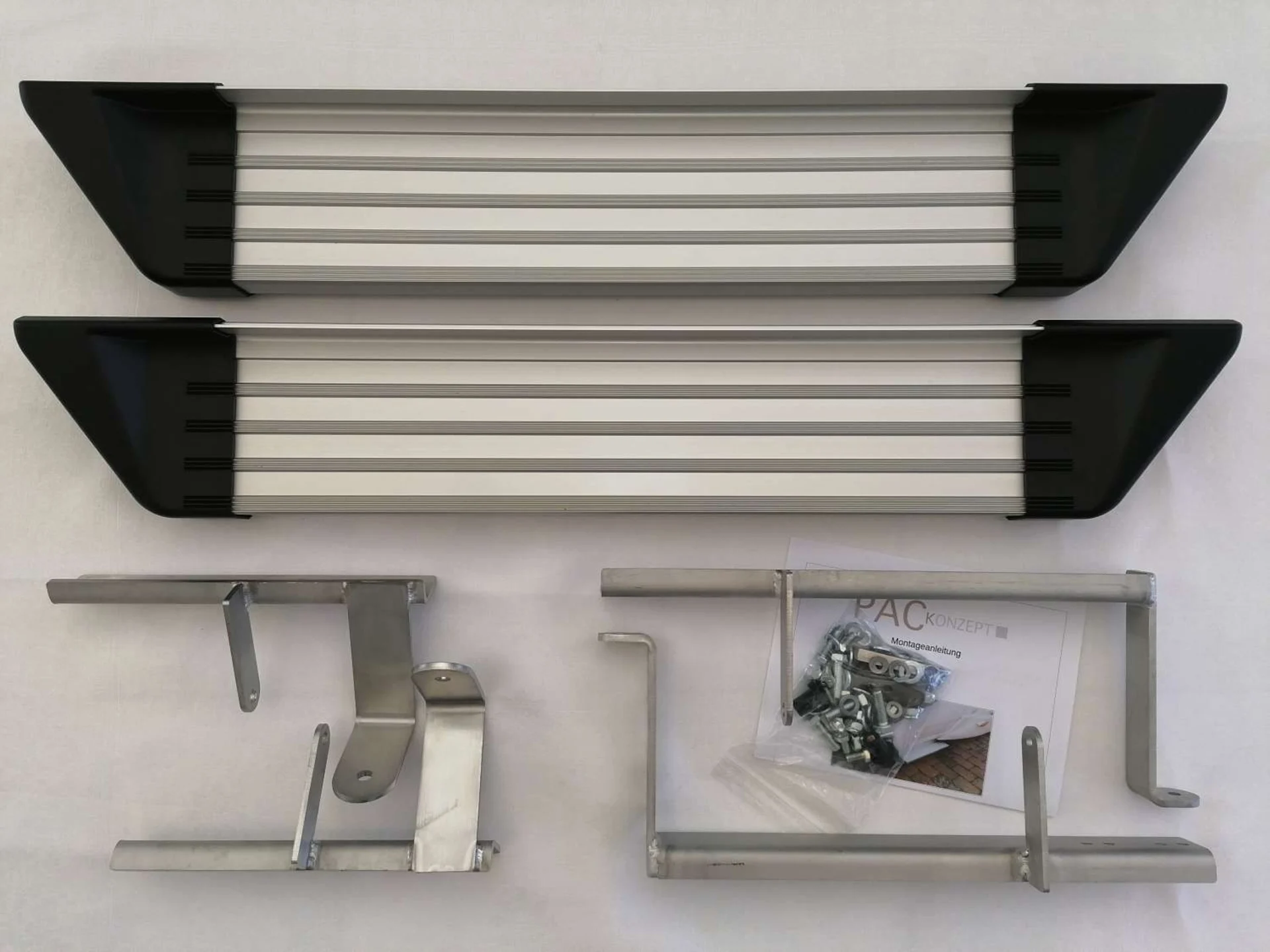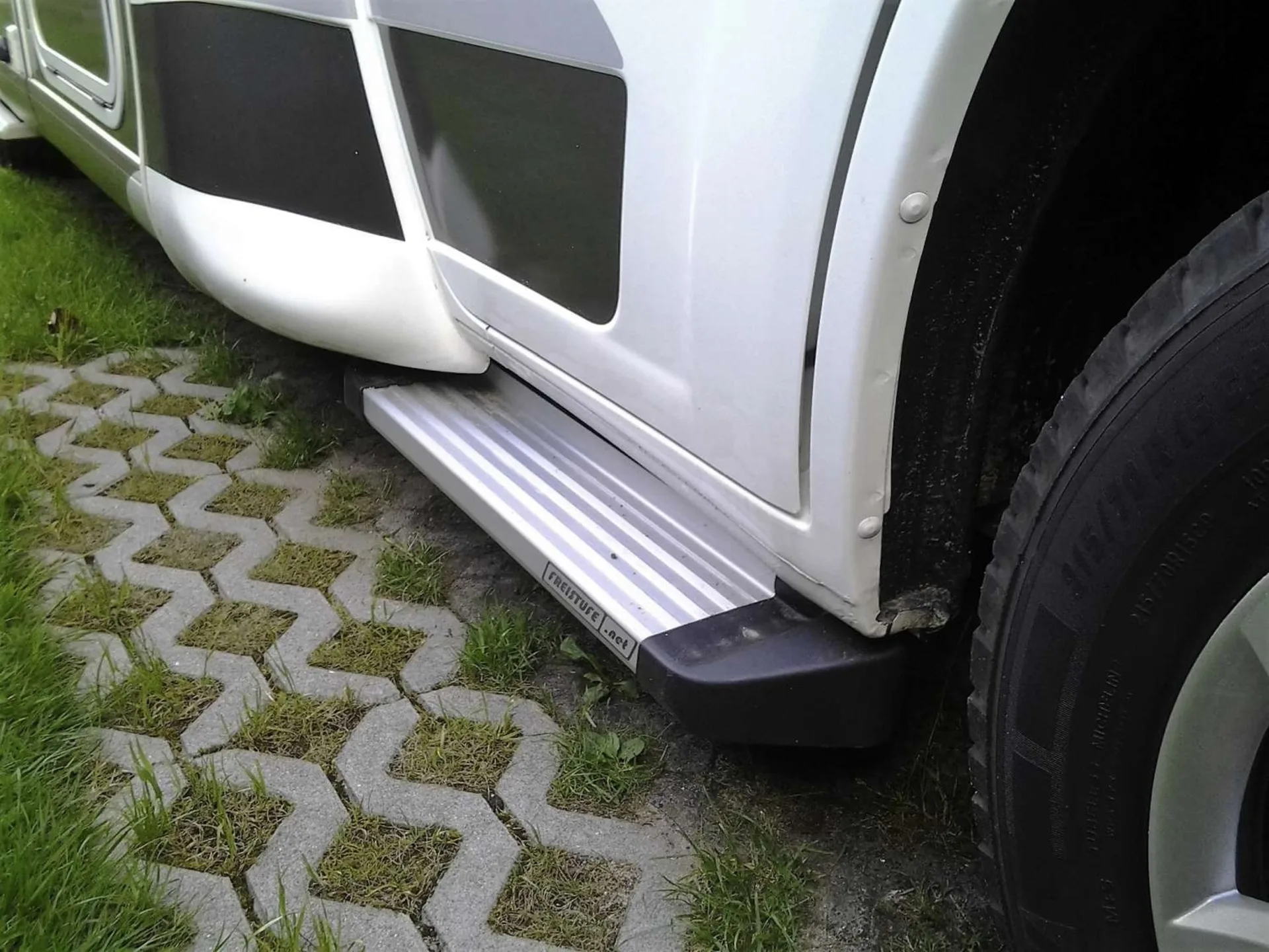 Aluminiumprofil mit verschraubten und optimierten Sicherheits-Kunststoffabdeckungen an den Enden und rutschhemmender Profilierung. Trittstufen aus eloxiertem Aluprofilen (einstell- und anpassbar an dein Reisemobil) mit rutschsicherer Profilierung und stabilen Kunststoff-Endkappen. Der Freistufensatz wird durch fahrzeugspezifische und mitgelieferte Edelstahlkonsolen am und unter dem Fahrzeugholm fest verschraubt. Somit verändert sich die Einstiegshöhe von 46 cm auf angenehme 23 cm. Ein willkommener Nebeneffekt der Freistufen ist, dass die Fahrer- und Beifahrertür sowie die B-Säule des Fahrzeugs sauber bleibt, da der von den Vorderreifen aufgewirbelten Schmutz und Regen unter der Freistufe verbleiben.