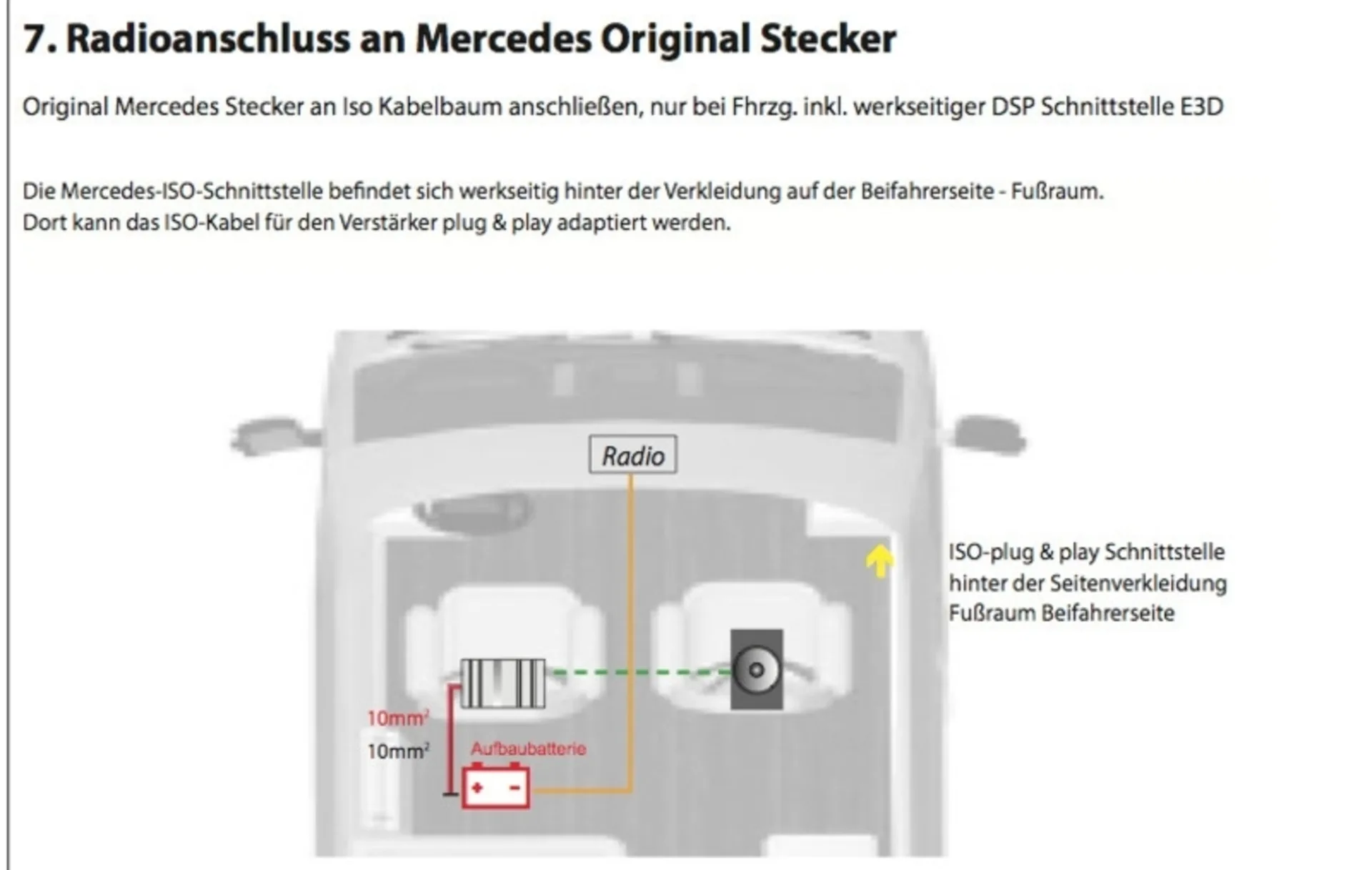 Dieser Adapter passt an OEM-Radios des Mercedes Sprinters W907/W910 – inkl. werkseitigem Mercedes Radio, nur notwendig bei Modellen OHNE E3D DSP Schnittstelle (kann in der Zubehörliste von Mercedes geprüft werden oder im Fahrzeug in der Beifahrerseite-Fußraum).