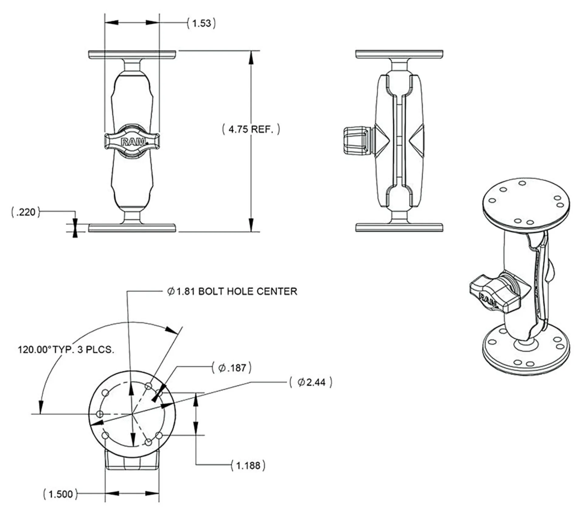 Im Einzelnen besteht das Set aus zwei runden Basisplatten und einem mittleren Verbindungsarm. Die runden Basisplatten besitzen zwei Lochraster - AMPS 4-Loch sowie 120° 3-Loch. Das AMPS-Lochraster ist passend für viele RAM Mounts Geräte-Halteschalen.